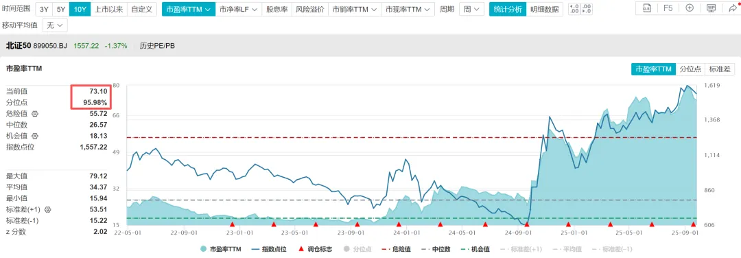 6.4、根据WIND数据,截至2025年9月25日,北证50指数的市盈率TTM=73.10倍,处于历史估值百分位95.98%的位置;市净率=5.48倍,处于历史估值百分位98.28%的位置;股息率0.68%,处于历史估值百分位3.45%的位置。从这些数据来看,已经是高估的状态。