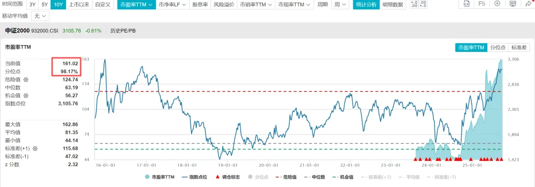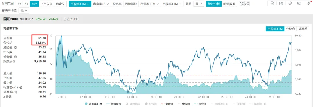 4.1、根据WIND数据,截至2025年9月25日,国证2000指数的市盈率TTM=61.70倍,处于近十年估值百分位84.54%的位置;市净率=2.66倍,处于近十年估值百分位74.56%的位置;股息率1.01%,处于近十年估值百分位45.3%的位置。国证2000指数当前看已经不算很便宜了。