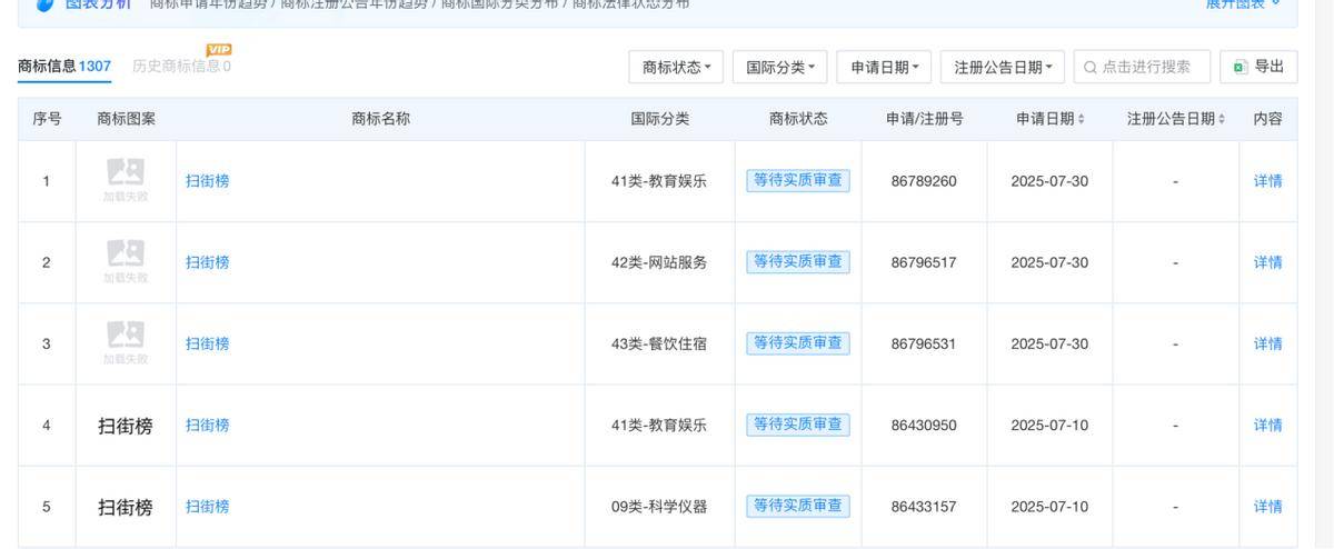 天眼查APP商标信息显示,到今年7月份,高德才申请了“扫街榜”的多项商标。