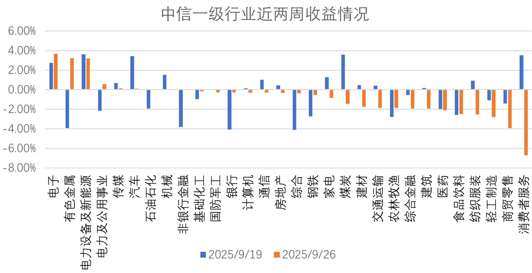 上周(2025/9/22-2025/9/26)中信一级行业多数下跌,行业分化剧烈。消费者服务板块领跌,周跌幅达6.71%;商贸零售、轻工制造等板块也跌幅较大。仅电子、有色金属、电力设备及新能源等少数板块显著上涨,电子板块周涨幅为3.67%。从板块变动来看,电子等少数板块受资金关注,消费者服务等板块则遭资金抛售。整体而言,大部分行业板块表现疲弱,市场缺乏广泛的做多主线,资金对于行业的偏好较为集中,行业间的分化进一步凸显,市场表现出结构性行情。