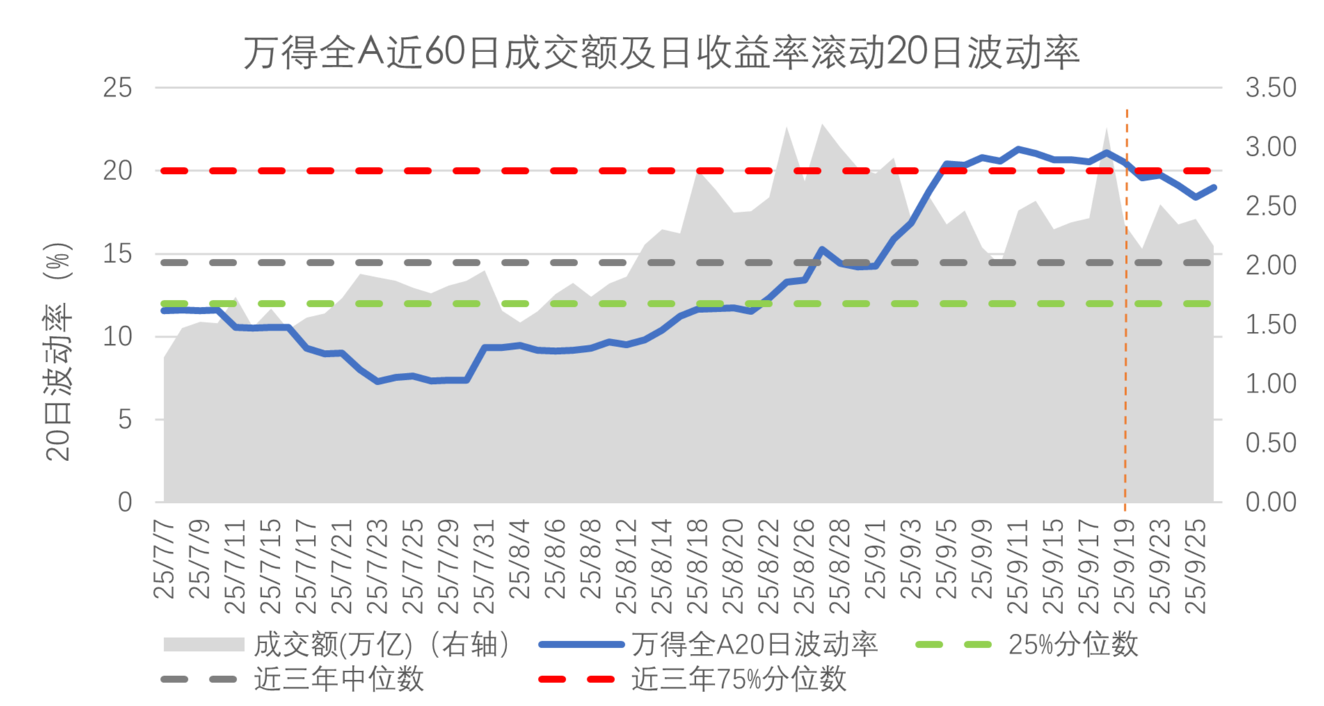 上周(2025/9/22-9/26),贝塔风格收益有一定反转迹象,其他风格累计收益相对平淡;近三年主要风格收益20日波动方面,贝塔风格波动虽有降低,但仍处于较高位置。其他风格波动也处于相对高位。综合而言,市场风格虽仍有向贝塔风格倾斜的特征,但相较于此前,贝塔风格的强势表现有所缓和,资金对高风险高收益类资产的偏好虽仍在,但可能有所收敛,风格间的资金分布相对更均衡一些。