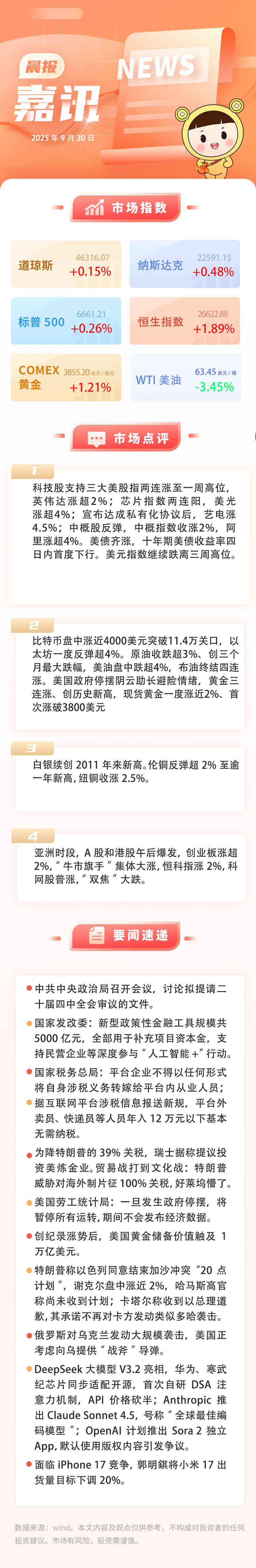 9月30日嘉讯:芯片指数两连阳,DeepSeek大模型V3.2亮相