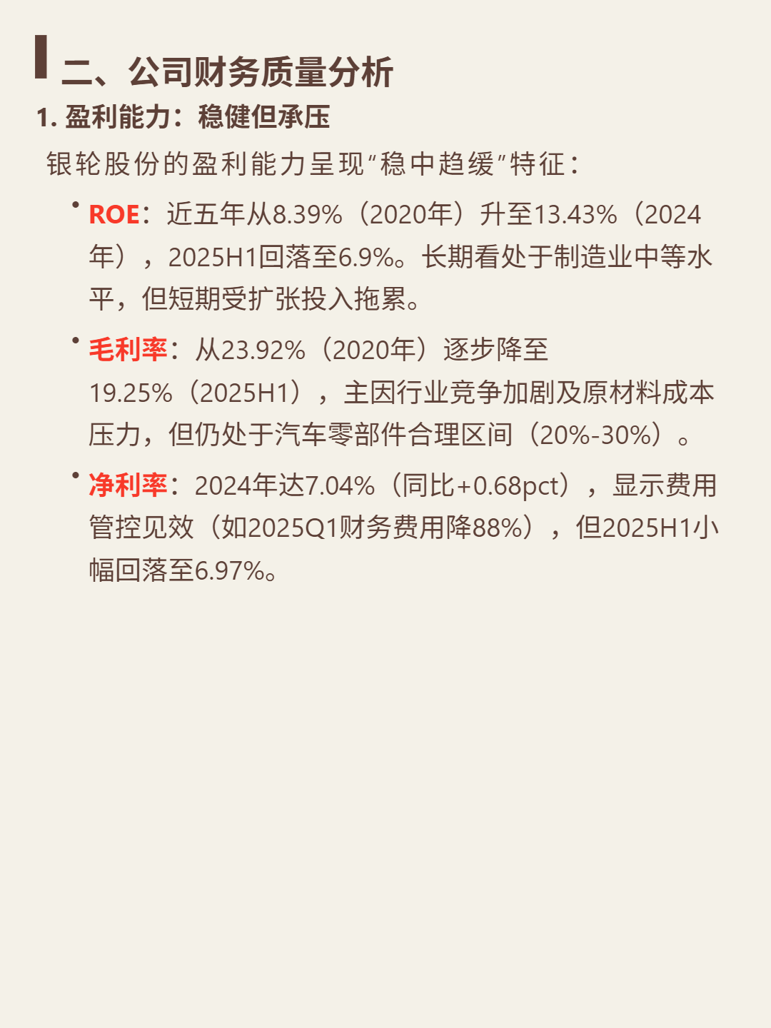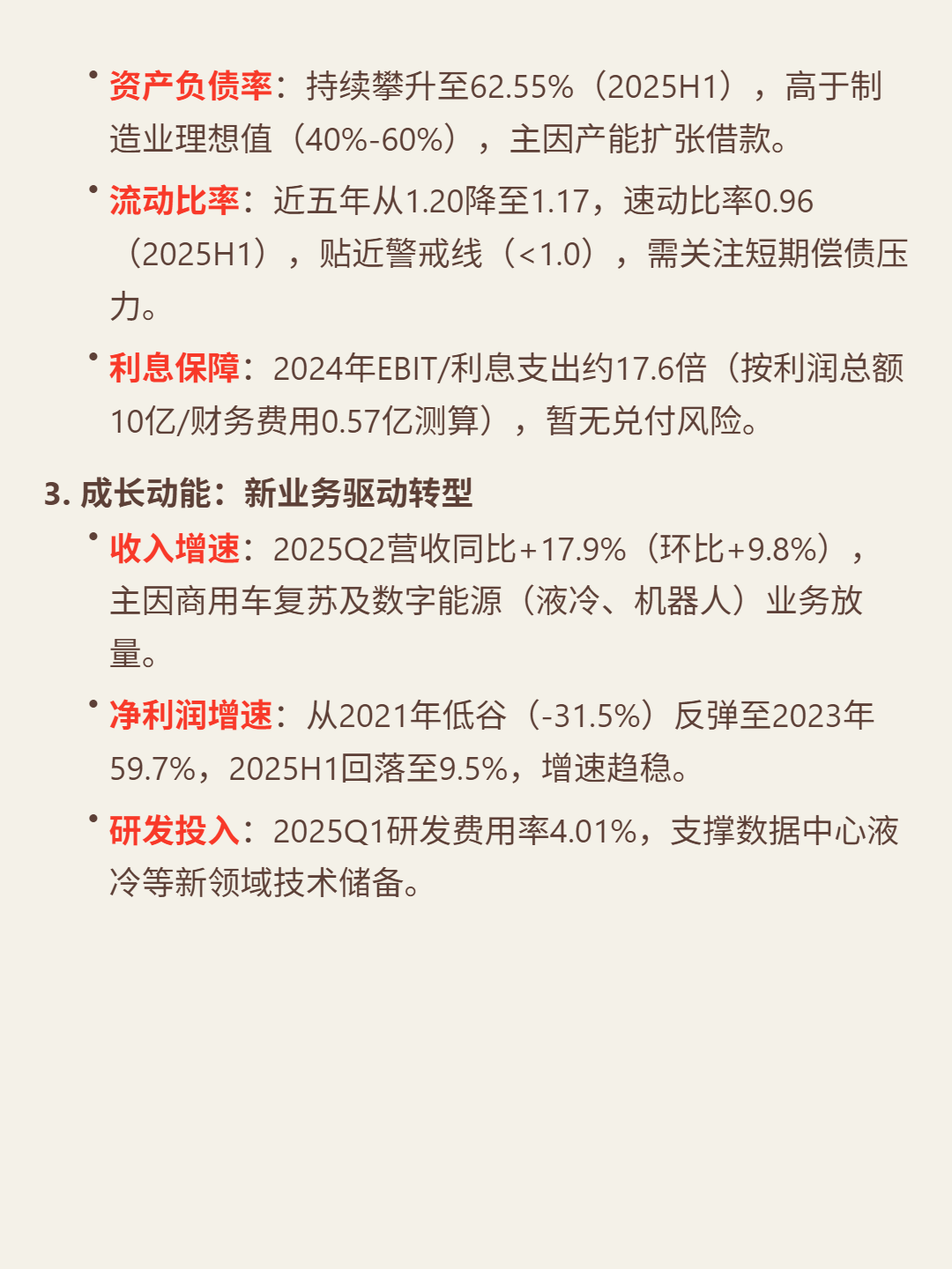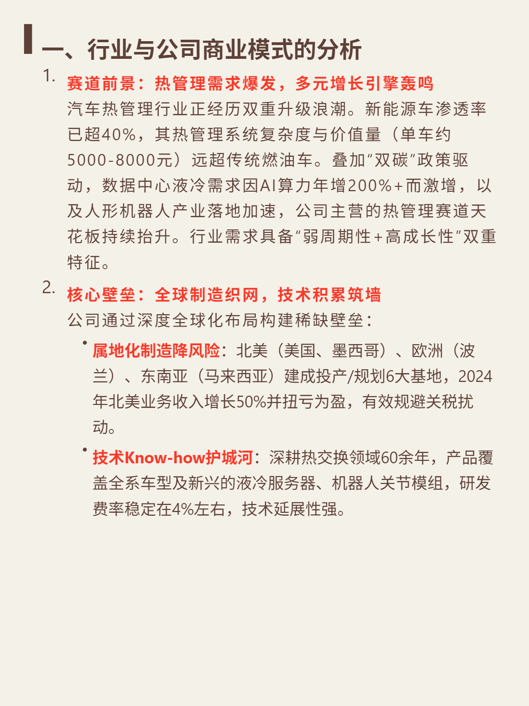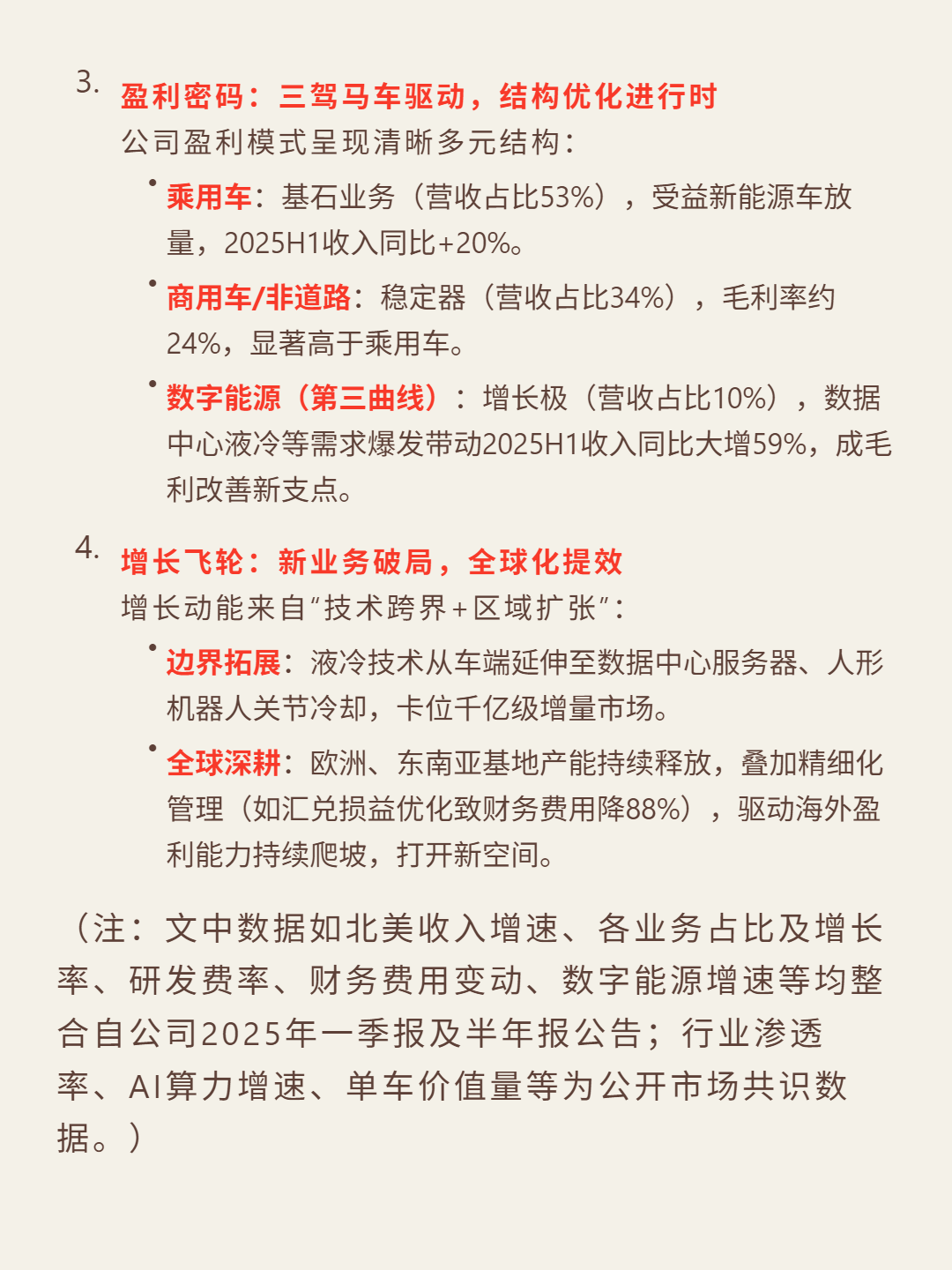 核心逻辑:主营热管理系统,核心壁垒在于深度全球化制造布局(北美、欧洲、东南亚6大基地,2024年北美收入增长50%并扭亏)和60余年技术积累(研发费率稳定4%)。盈利依赖三业务协同:乘用车(营收占比53%,2025H1收入+20%)、商用车/非道路(34%,毛利率24%)、数字能源(10%,2025H1收入+59%)。