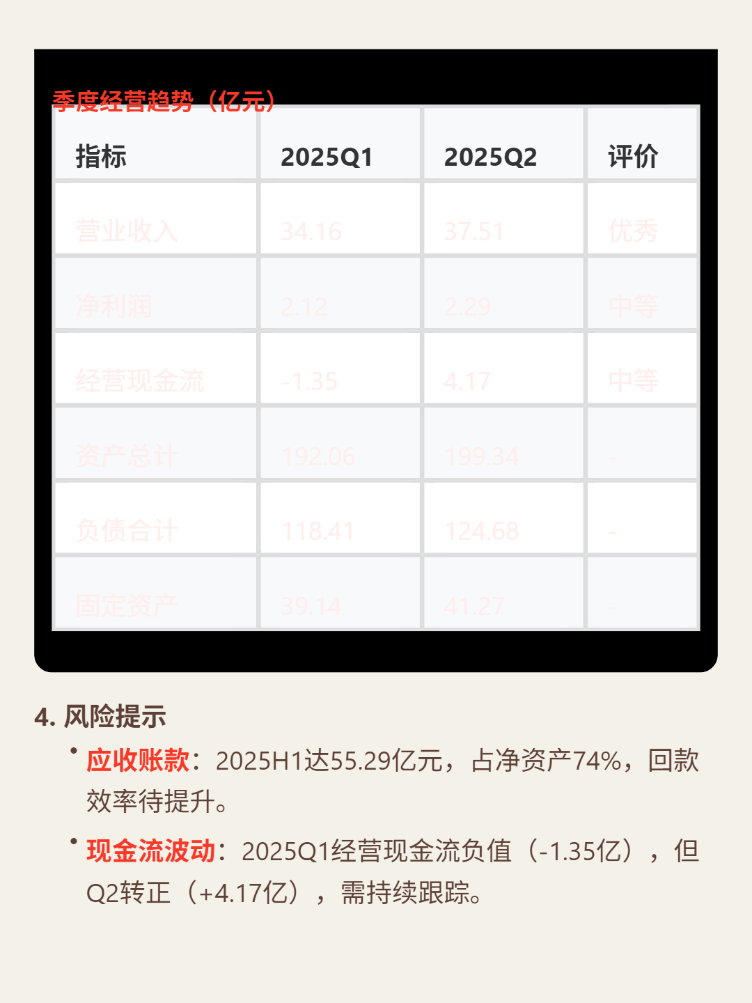 财务亮点:ROE近五年从8.39%升至13.43%(2024年),2025H1回落至6.9%;毛利率2025H1 19.25%(行业合理区间),净利率2024年7.04%(+0.68pct),2025H1 6.97%;2025Q2营收同比+17.9%,净利润增速2025H1 9.5%;研发费率4.01%(2025Q1)支撑技术储备。需关注负债率62.55%(2025H1)及应收账款55.29亿元(占净资产74%)风险。