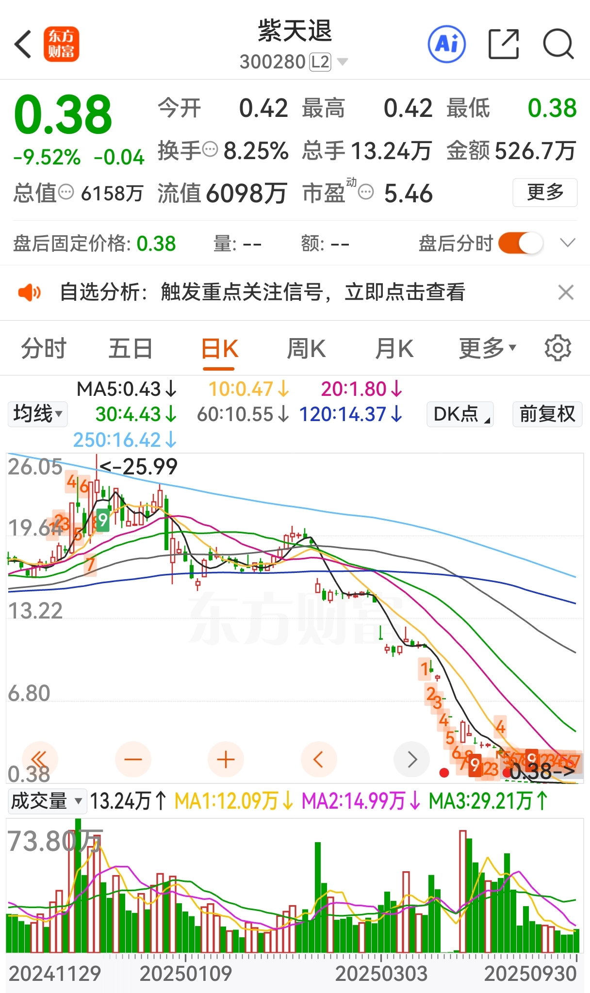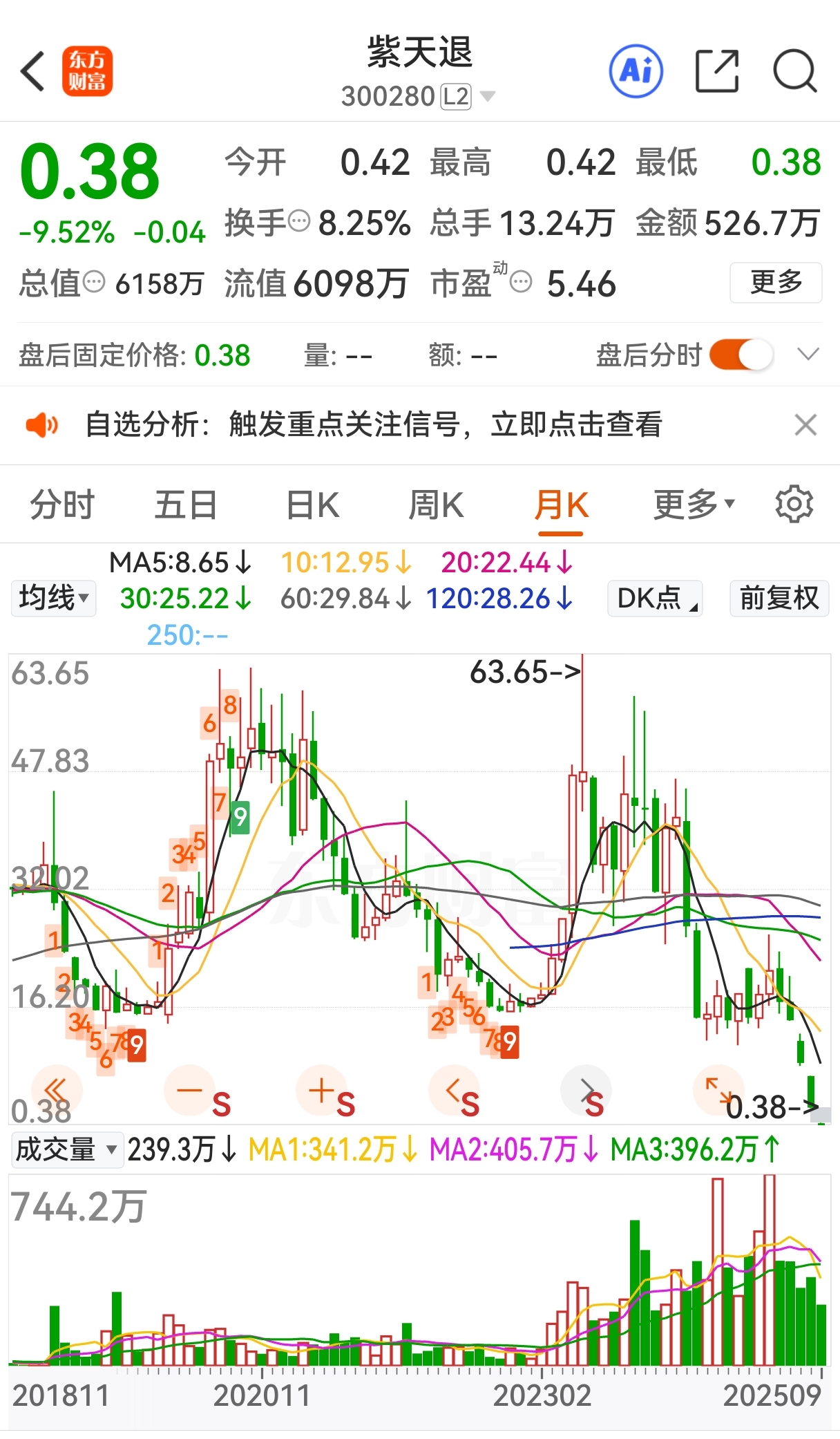 2025年9月17日,*ST紫天复牌进入退市整理期,停牌前公司股价是2.74元。 由于进入退市整理期的首个交易日没有涨跌幅限制,当天开盘大幅低开于0.65元,收盘报收于0.63元,下跌77.01%。公司总市值仅剩下1.02亿元,与其高峰期相比,简直是天壤之别。