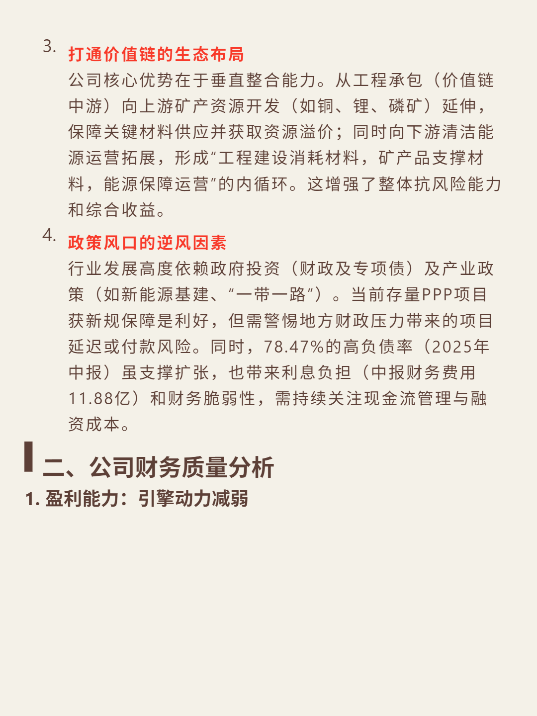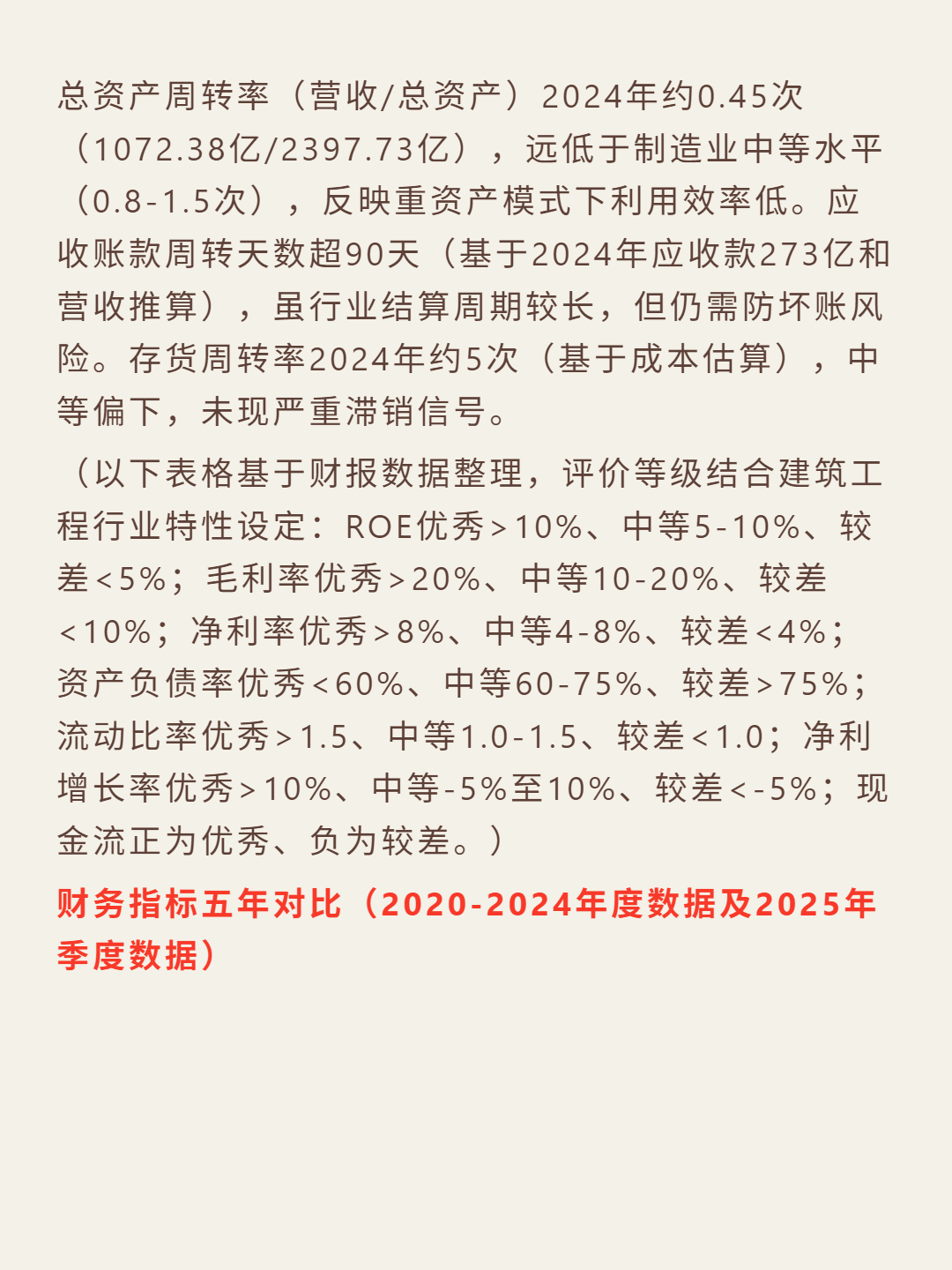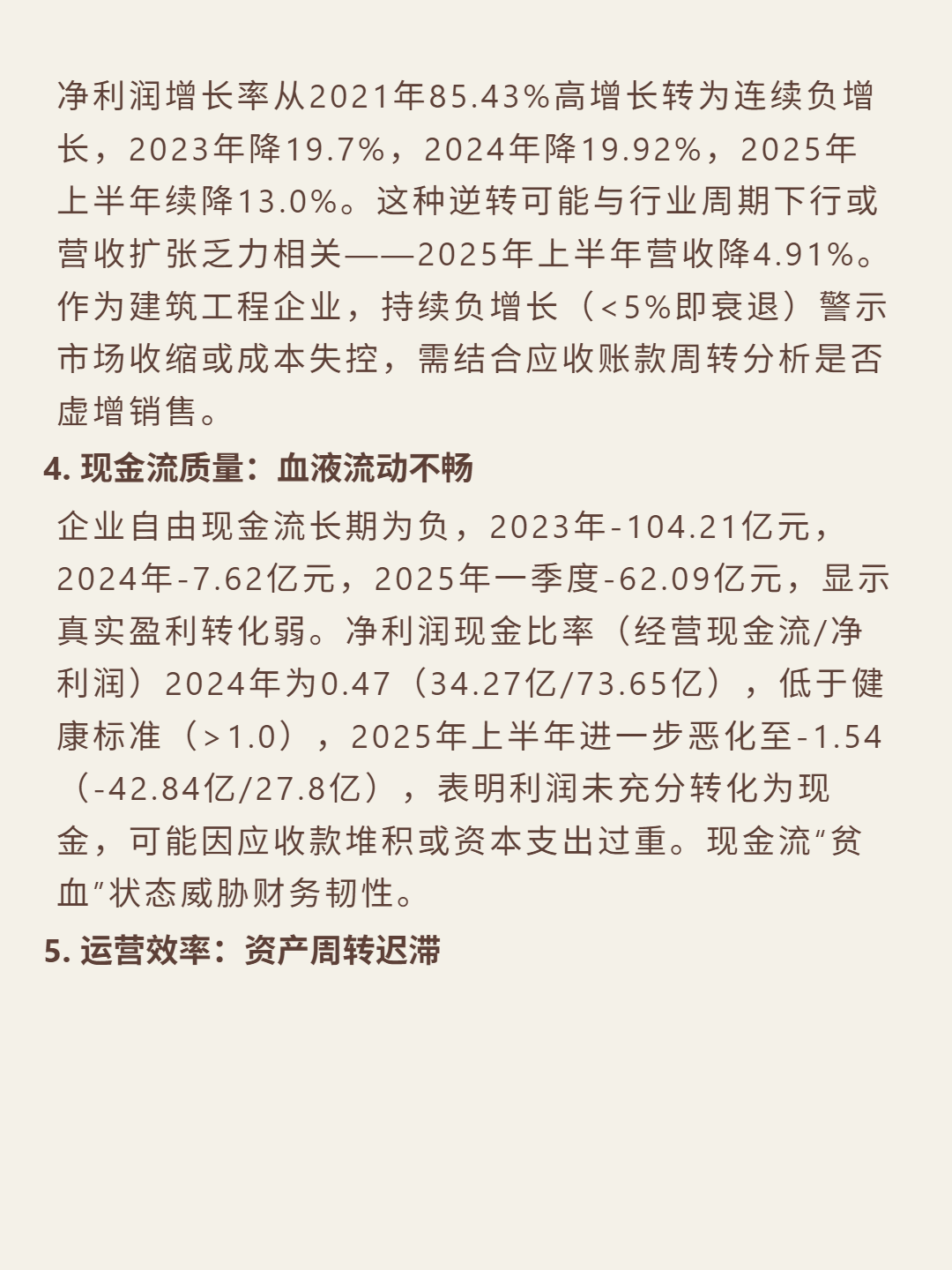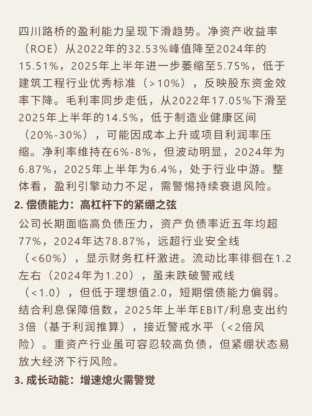 财务数据:ROE从2022年32.53%降至2025H1的5.75%;净利润连续负增长(2023年-19.7%、2024年-19.92%、2025H1-13%),2025H1营收降4.91%;资产负债率78.47%(超行业60%安全线),流动比率1.3,利息保障倍数约3倍;经营现金流2025H1-42.84亿,净利润现金比率-1.54;总资产周转率0.45次,应收账款周转超90天。