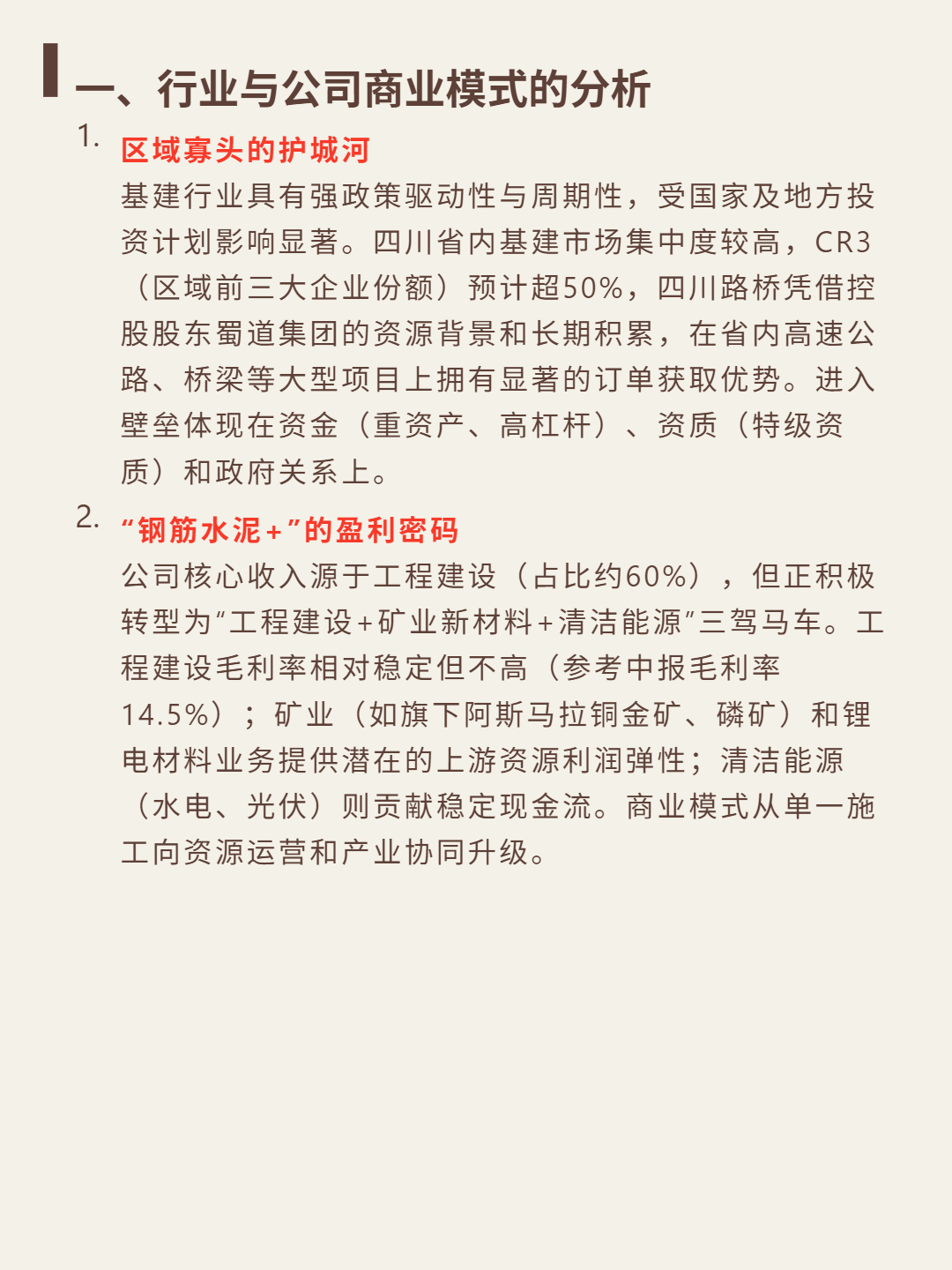 核心逻辑:四川基建CR3超50%的区域寡头,背靠蜀道集团,工程建设(60%收入)为基本盘,毛利率14.5%;转型“工程+矿业(铜金矿、磷矿)+清洁能源(水电、光伏)”,矿业提供利润弹性,清洁能源贡献现金流。壁垒在资金(高杠杆)、特级资质与政府关系。