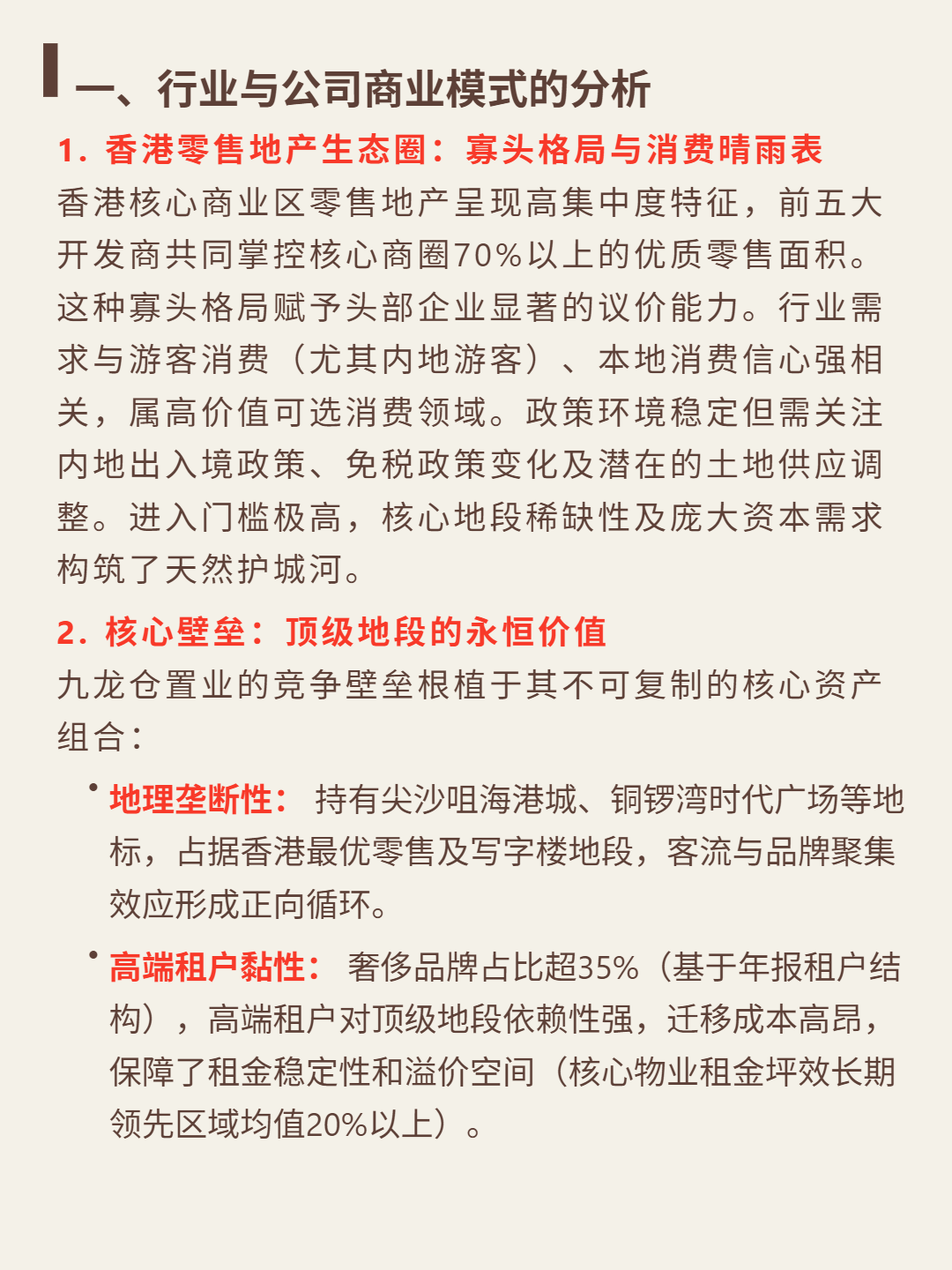 核心逻辑:香港零售地产寡头格局,前五大开发商掌控70%核心商圈面积。九龙仓持有海港城、时代广场等不可复制地标,占据最优零售地段,客流与品牌聚集形成正向循环。商业模式聚焦高端零售租金,奢侈品牌租户占比超35%。