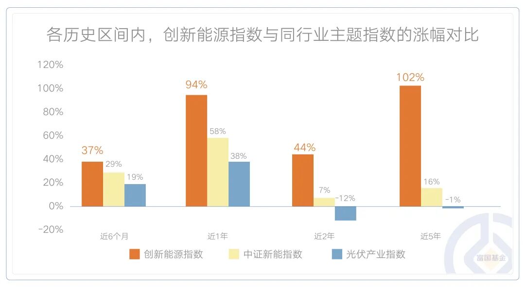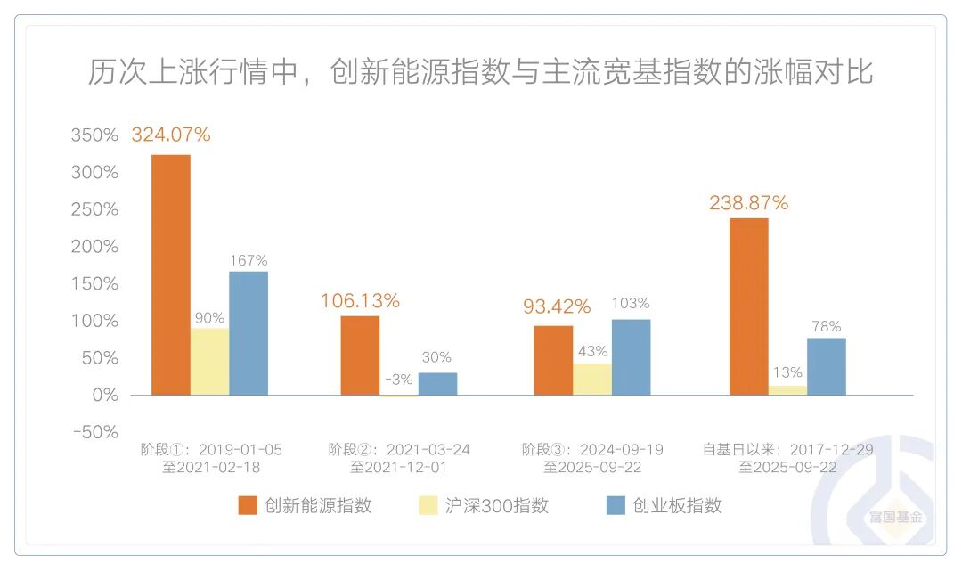 落实到业绩表现上,创新能源指数的表现不俗。自基日以来,累计涨幅超过238%,显著跑赢沪深300指数和创业板指数。更重要的是,在最近的3轮上涨行情中,比如2019年至2021年的全面牛市、2021年的新能源“大年”,以及去年的“9·24”行情,创新能源指数都展现出了更强的上攻弹性,超额收益可观。