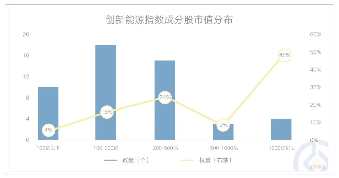 市值方面,创新能源指数成分股的总市值约3.36万亿元,平均市值约670亿元,体现了板块的成熟度与规模效应。龙头引领作用显著,千亿市值公司权重占比近50%,使指数整体更具稳定性和代表性;同时,创新能源指数还包含了28家市值低于200亿元的公司,其多为细分领域的技术领先者,有望为指数贡献良好的成长弹性。