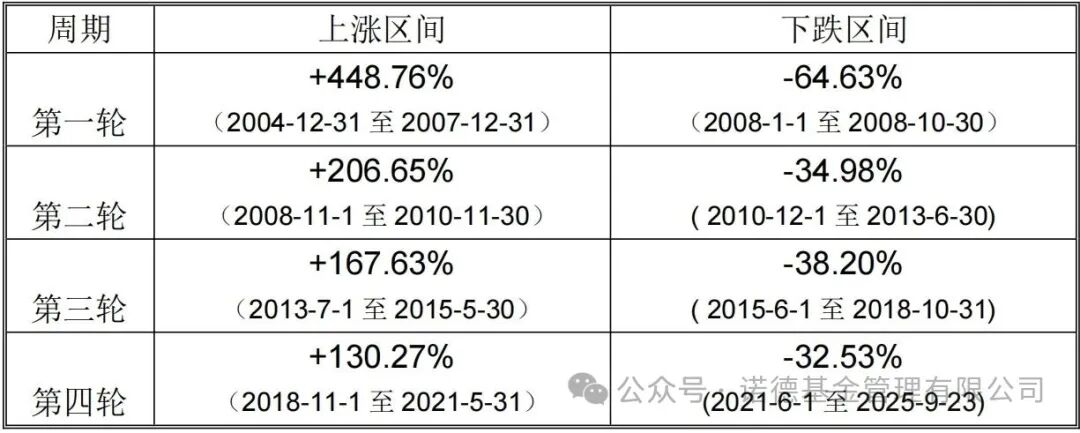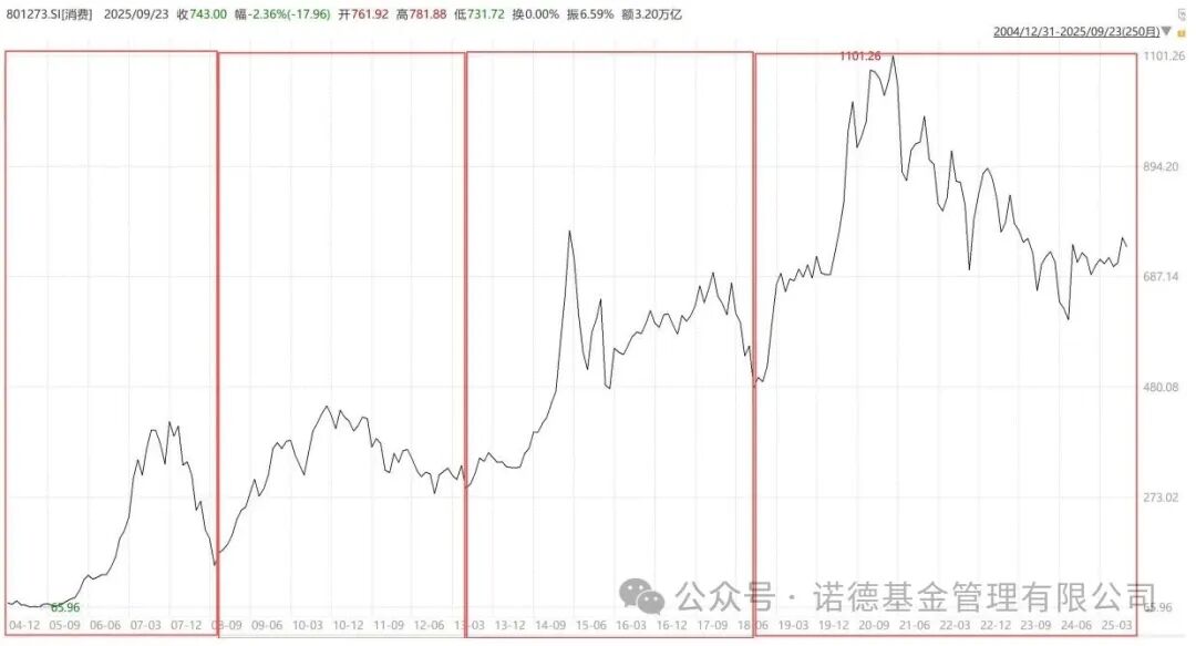 从行业周期角度看,回顾2005年以来的申万消费指数的历史走势,消费行业共经历了四轮完整的涨跌周期: