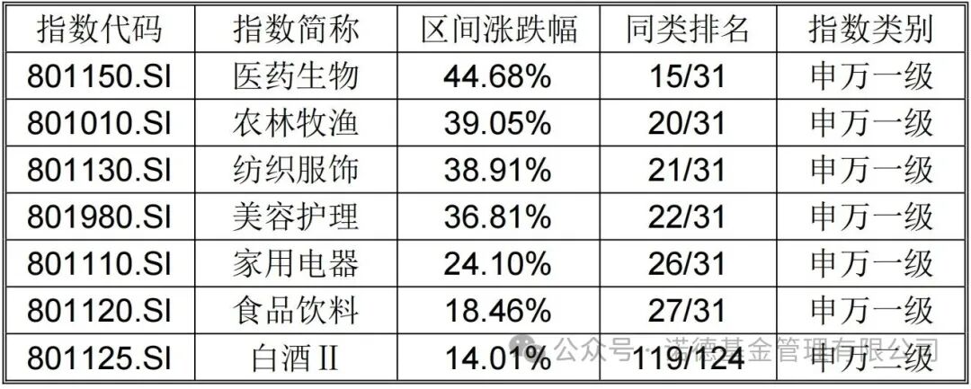 从申万一级/二级细分行业表现来看,大消费相关板块多数走势低迷。在申万一级行业中,除医药生物表现居中游外,农林牧渔、美容护理、纺织服饰等行业涨幅均处于中下游水平,家用电器、食品饮料更是涨幅靠后。尤其值得注意的是,白酒行业作为消费板块的重要代表,期间累计上涨14.01%,在124个申万二级行业中位列第119位。