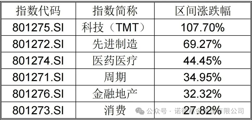自2024年“924”行情启动至今,A股市场呈现出鲜明的结构性特征。以半导体、电子、通信为代表的科技板块表现相对强势,申万科技(TMT)指数期间累计涨幅达107.70%,显著领先于其他风格指数。相比之下,消费板块整体表现疲软,申万消费指数同期涨幅仅为27.82%,在六大风格指数中排名末位。