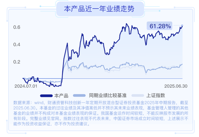 本基金致力于捕捉本轮AI浪潮下的AI应用与算力的相关机会,业绩表现亮眼,近一年净值增长达61.28%,超越同期上证指数(16.08%)与业绩比较基准(16.64%)。