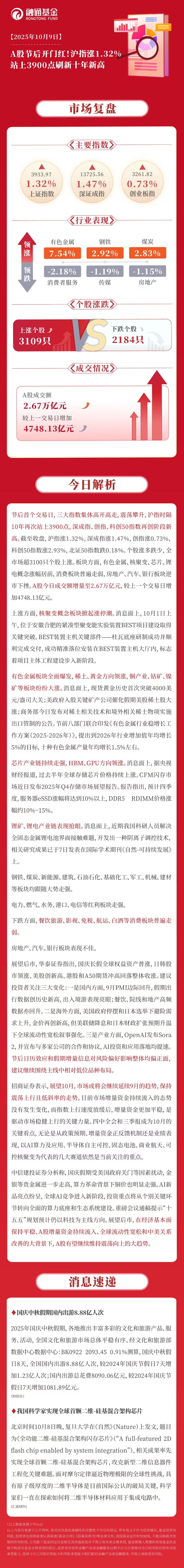 节后首个交易日,三大指数集体高开高走,震荡攀升,沪指时隔10年再次站上3900点,深成指、创指、科创50指数再创阶段新高。截至收盘,沪指涨1.32%,深成指涨1.47%,创指涨0.73%,科创50指数涨2.93%,北证50指数跌0.18%。