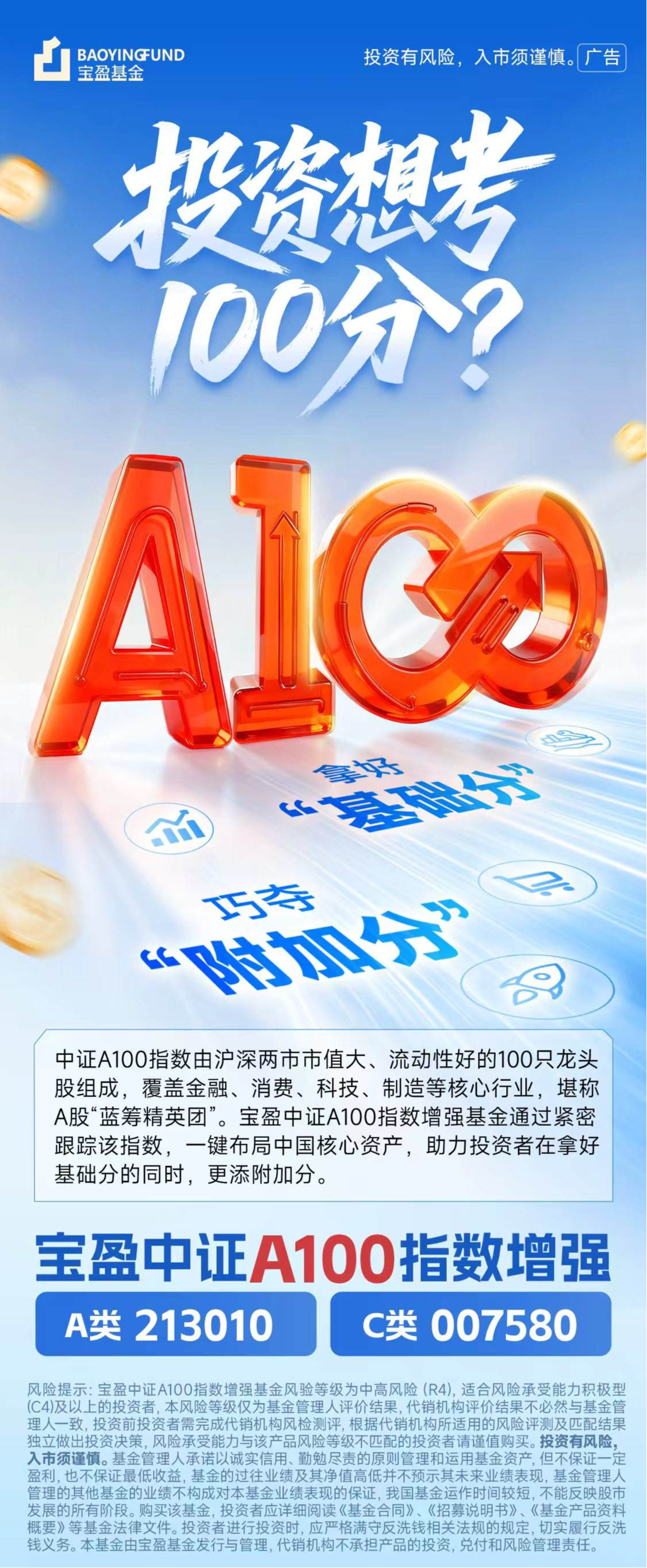 中证A100指数由沪深两市市值大、流动性好的100只龙头股组成,覆盖金融、消费、科技、制造等核心行业,堪称A股“蓝筹精英团”。宝盈中证A100指数增强基金通过紧密跟踪该指数,一键布局中国核心资产,助力投资者在拿好基础分的同时,更添附加分。