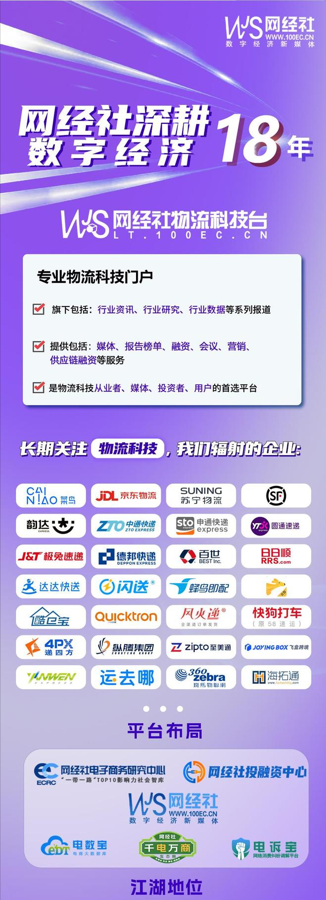网经社深耕数字经济行业18年,长期关注物流科技,我们辐射的企业有:菜鸟、京东物流、苏宁物流、顺丰、韵达、中通快递、申通快递、圆通速递、极兔速递、德邦快递、百世、日日顺、达达快送、闪送、蜂鸟即配、酷仓宝、风火递、快狗打车、纵腾集团、至美通、飞盒跨境、递四方、运去哪、海拓通。