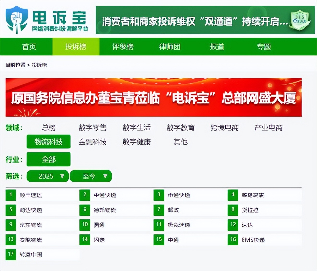 据网络消费纠纷调解平台网经社“电诉宝”2025年至今受理的中国物流科技领域用户有效投诉显示,入选投诉榜的依次为:顺丰速运、中通快递、申通快递、菜鸟裹裹、韵达快递、德邦物流、邮政、货拉拉、京东物流、圆通、极兔速递、达达、安能物流、闪送、中通、EMS快递、转运中国。