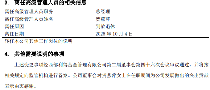 10月10日,西部利得基金发布公告称,公司总经理贺燕萍退休离任,董事长何方代任总经理一职。