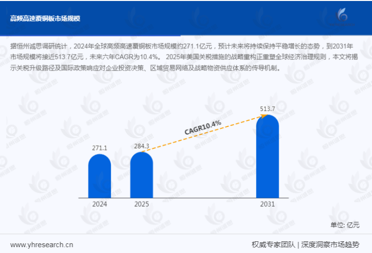 从市场发展现状来看,高频高速覆铜板领域正呈现出强劲的增长态势。据YHResearch调研团队最新发布的报告显示,预计到2031年,全球高频高速覆铜板市场规模将达到513.7亿元。这一数据充分表明了该市场巨大的发展潜力。未来几年,其年复合增长率CAGR为10.4%,如此高的增长率预示着高频高速覆铜板市场将在未来持续保持高速发展。