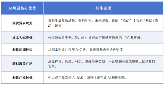 AI短剧的核心优势之一在于其将AI生成技术(AIGC)与影视级视觉表达深度融合,打破了传统影视制作中高成本、长周期、重人力的瓶颈。具体来看,多重优势如下:
