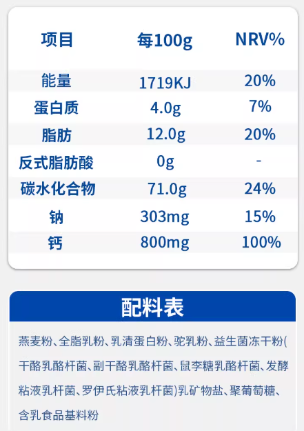营养成分表中却显示,其蛋白质含量为4g/100g,且驼乳粉排在配料表第四位,在此之前的成分还包括燕麦粉、全脂乳粉、乳清蛋白粉。