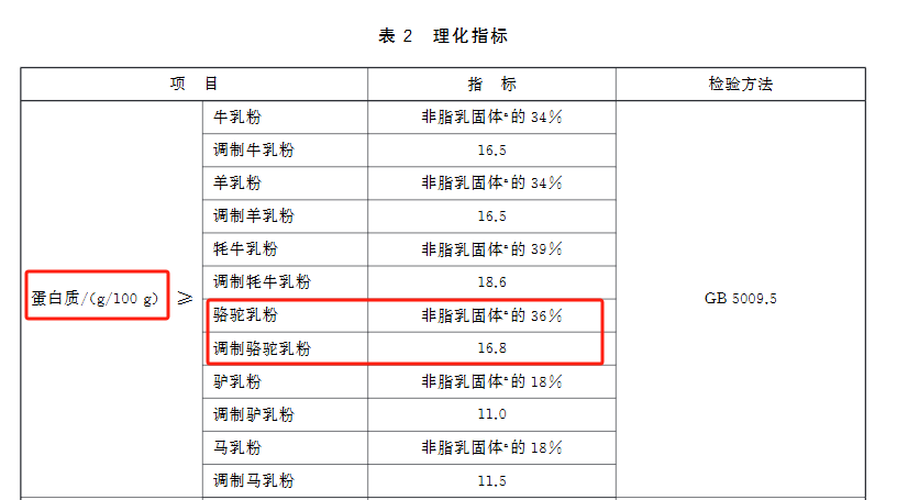 此外,GB19644对各类乳粉、调制乳粉的蛋白质、脂肪等项目提出了指标要求。其中,对驼乳粉、调制驼乳粉的蛋白质含量要求分别为≥非脂乳固体的36%、≥16.8g/100g。