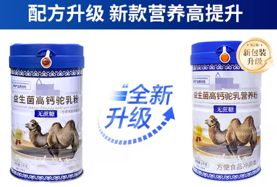 记者随机点击进入一款驼乳粉的链接后发现,商家在页面介绍中提示消费者,产品配方升级、新款营养提升,产品名称从“益生菌高钙驼乳粉”变更为“益生菌高钙驼乳营养粉”。瓶身正下方的“方便食品冲调类”字眼清晰可见。