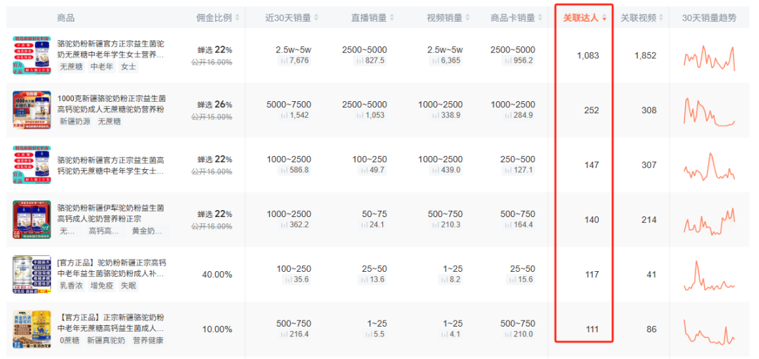 据蝉妈妈数据监测,当前关联骆驼奶直播的达人规模显著扩大,涵盖多领域创作者。他们通过聚焦“沙漠白金”的稀缺价值与营养优势,点燃消费者的购买热情。从数据上看,直播间的驼奶产品也屡创销量新高。