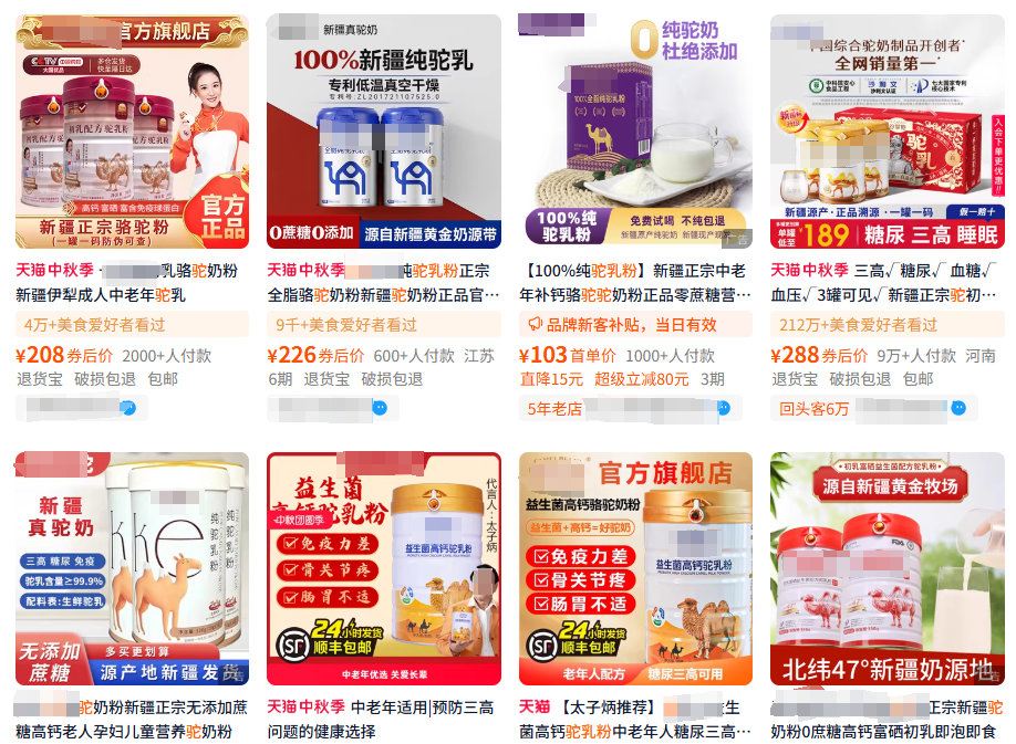打开电商平台搜索“骆驼奶粉”可发现,不少商家的产品主图或产品标题中都带有功效宣传,如提升免疫力、预防三高、降血糖等。