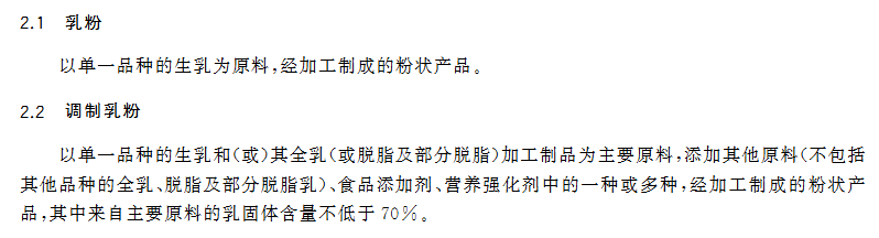 据今年2月8日实施的新版GB19644《食品安全国家标准 乳粉和调制乳粉》,将原定义中的“生牛(羊)乳”扩展为“生乳”,并首次增加了骆驼乳粉、牦牛乳粉、驴乳粉、马乳粉等的技术要求。