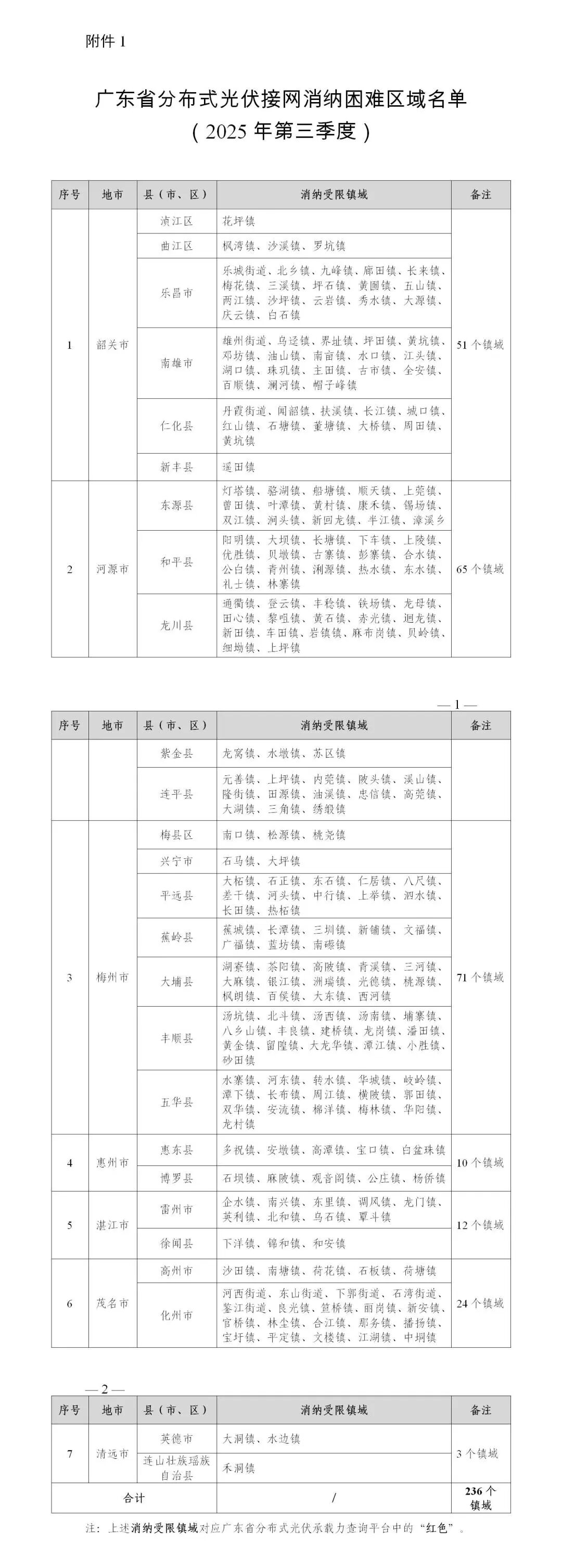 附件:1.广东省分布式光伏接网消纳困难区域名单(2025年第三季度)