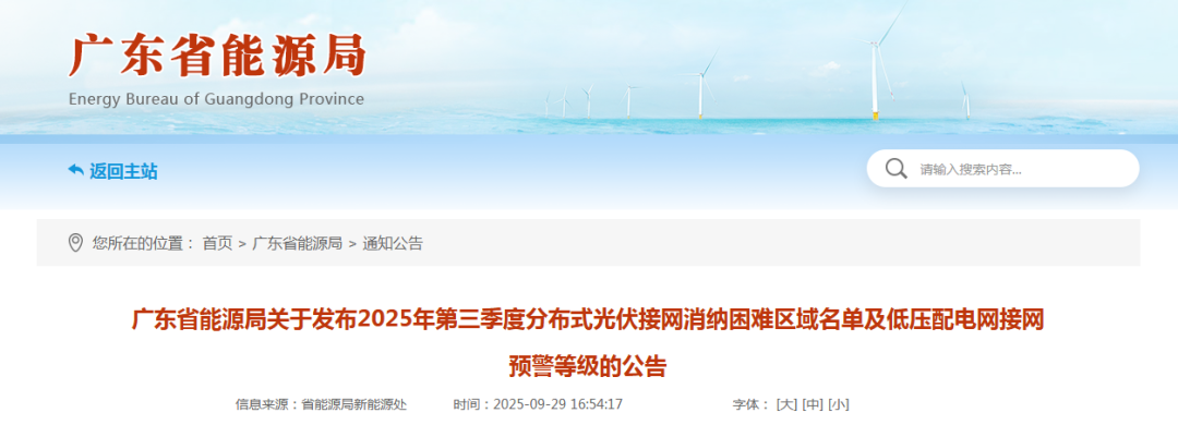 近日,广东省能源局发布2025年第三季度分布式光伏接网消纳困难区域名单及低压配电网接网预警等级的公告。