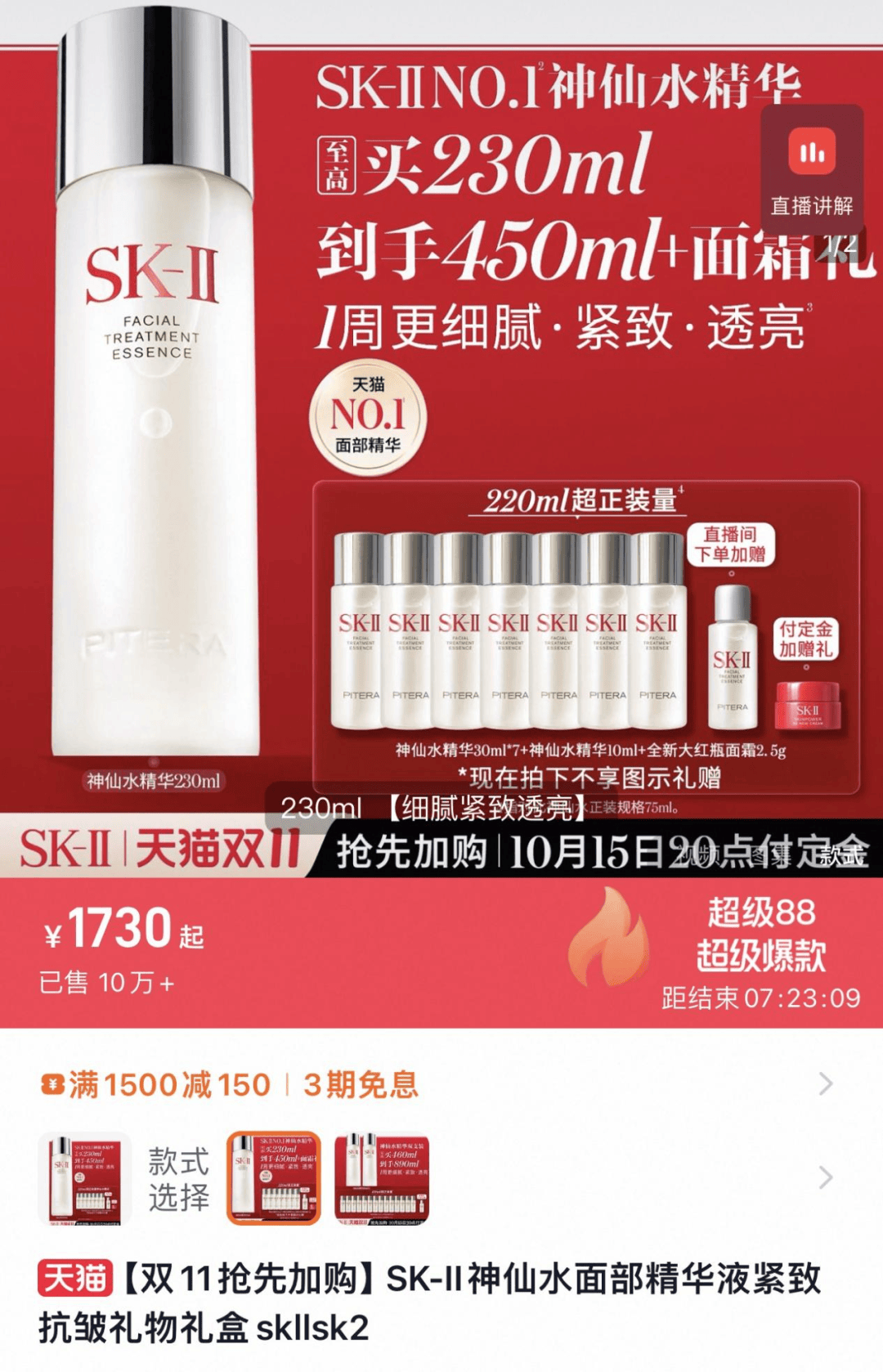 “神仙水”的正式产品名为SK-II面部精华液,SK-II宣称每瓶神仙水都含有90%以上Pitera,在天猫官方旗舰店上,神仙水标准装230ml/瓶售价为1730元。