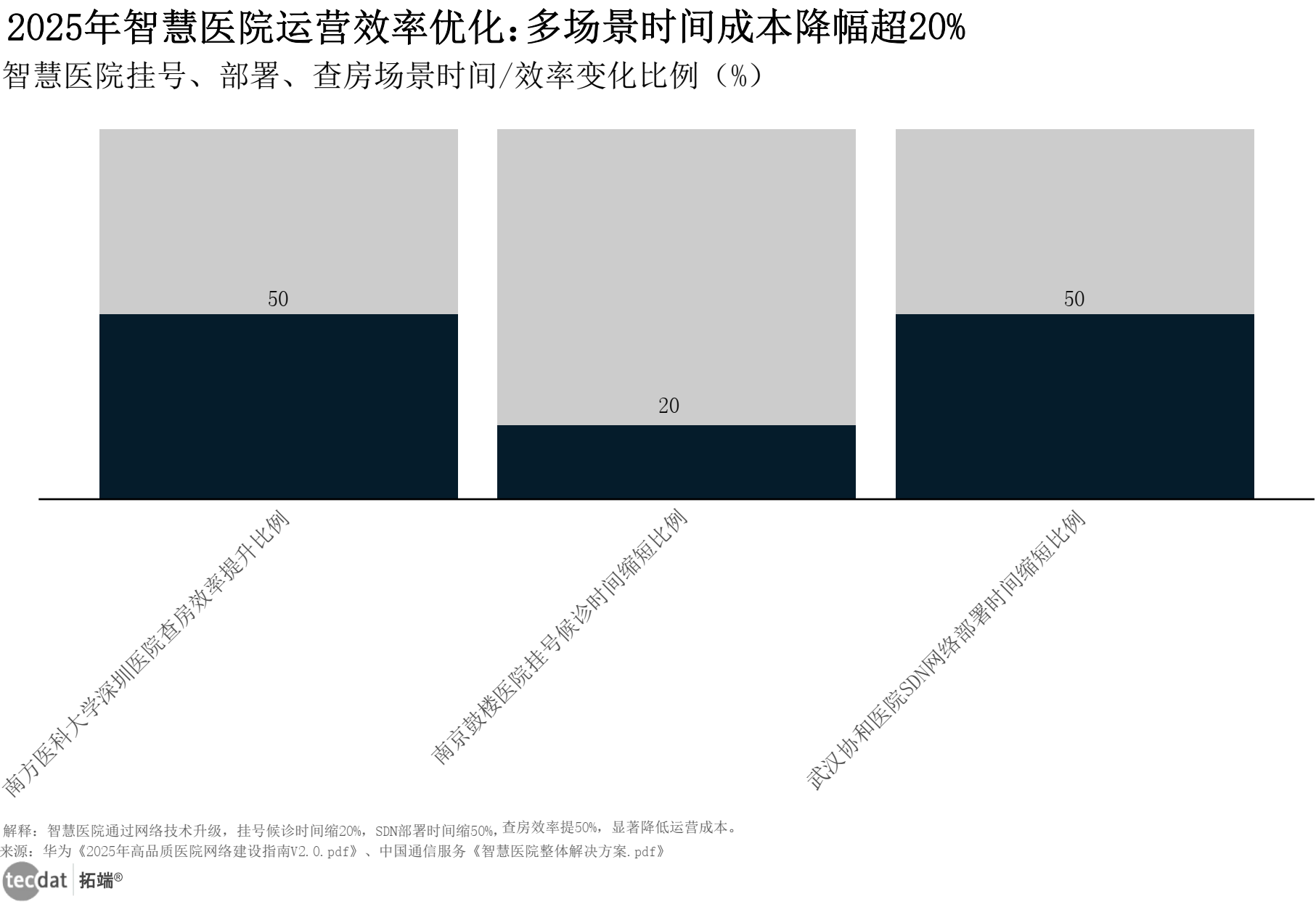 图表1-1展示产业链各端效率提升数据:应用端南京鼓楼医院挂号候诊时间缩短20%(患者受益),落地端武汉协和医院SDN网络部署时间缩短50%(医院降本),场景端南方医科大学深圳医院查房效率提升50%(医护提效)。3秒解读:智慧医院技术实现“患者-医院-医护”三方共赢,核心场景时间成本降幅超20%;行动建议:医院运营者可优先锁定“门诊挂号+病区网络”两大高痛点环节,参考武汉协和医院SDN部署方案(技术方:华为),3个月内完成1-2个病区改造,通过“候诊时间、部署周期”双指标验证效果。