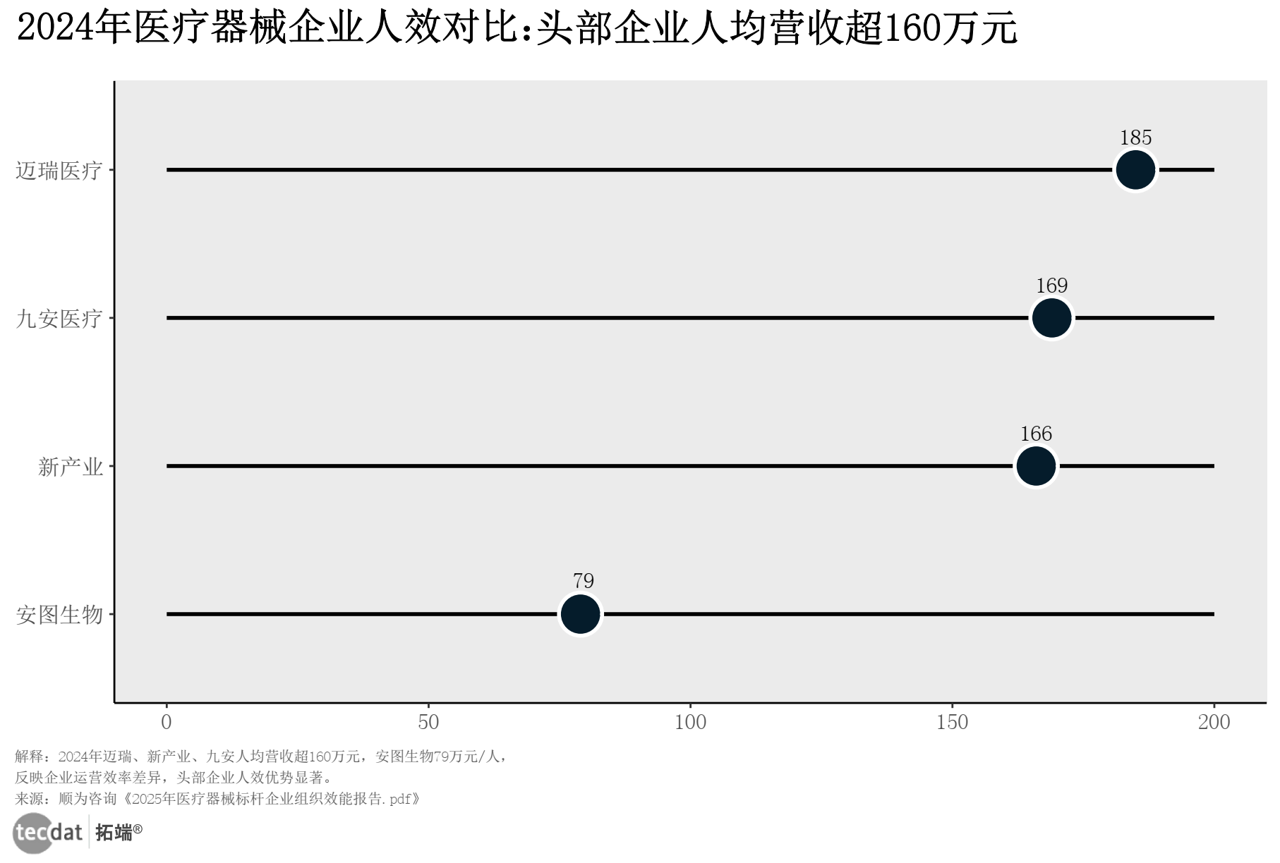 人效是医疗器械中游企业“成本控制-利润释放”的核心指标,2024年头部企业通过“流程优化(生产端)+技术升级(研发端)”提升人均营收,部分企业仍存在“人员冗余+流程滞后”问题。