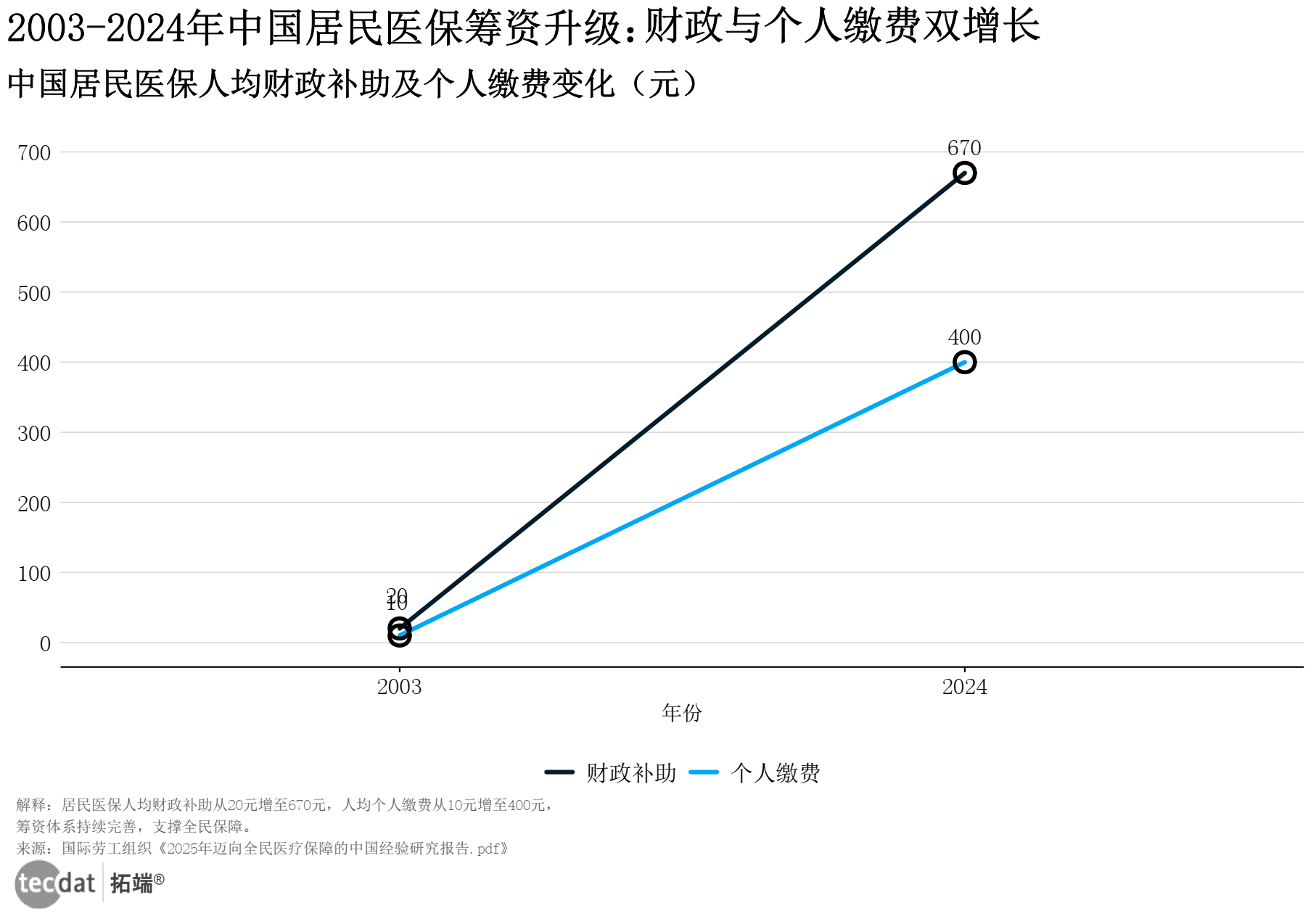 2003年中国居民医保刚起步时,筹资端(财政+个人)能力弱:人均财政补助仅20元(政府投入),个人缴费10元(参保端负担),导致保障端水平有限。随着政策推动(2016年城乡医保整合、2024年参保长效机制),筹资产业链持续完善,2024年形成“财政为主、个人为辅”的稳定模式。