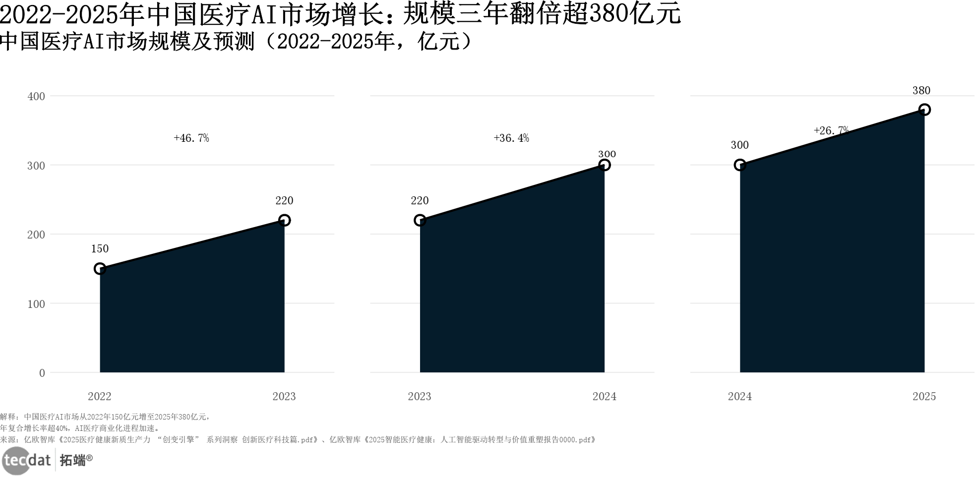 2022年中国医疗AI市场(全产业链)规模150亿元,随着政策支持(2024年《推动未来产业创新发展的实施意见》)与技术成熟(上游算法迭代),市场持续扩张,2025年预计突破380亿元,年复合增长率超40%,商业化集中在“基层医疗(下游)-细分应用(中游)”。