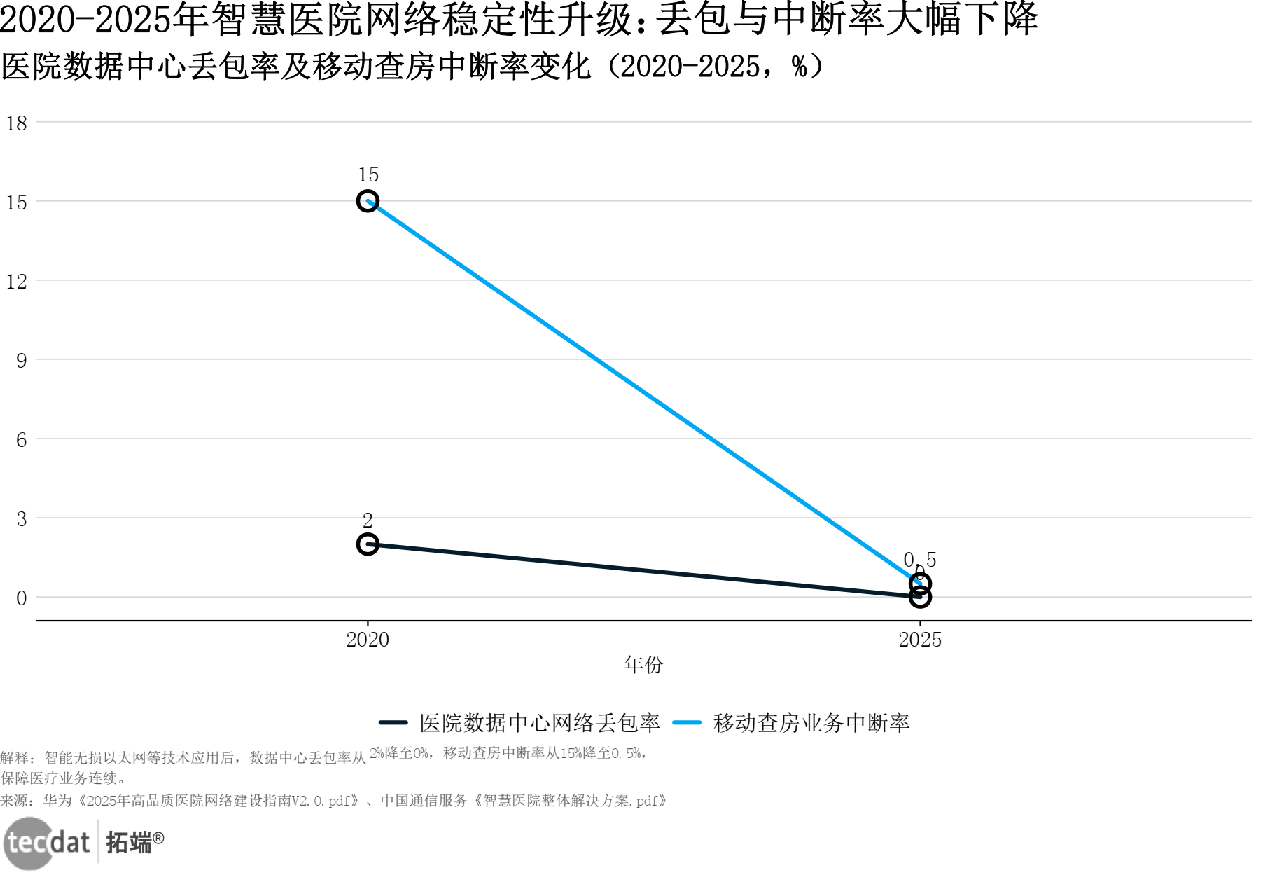 医院数据中心丢包率及移动查房中断率变化(2020-2025,%)图表数据及PDF模板已分享到会员群。