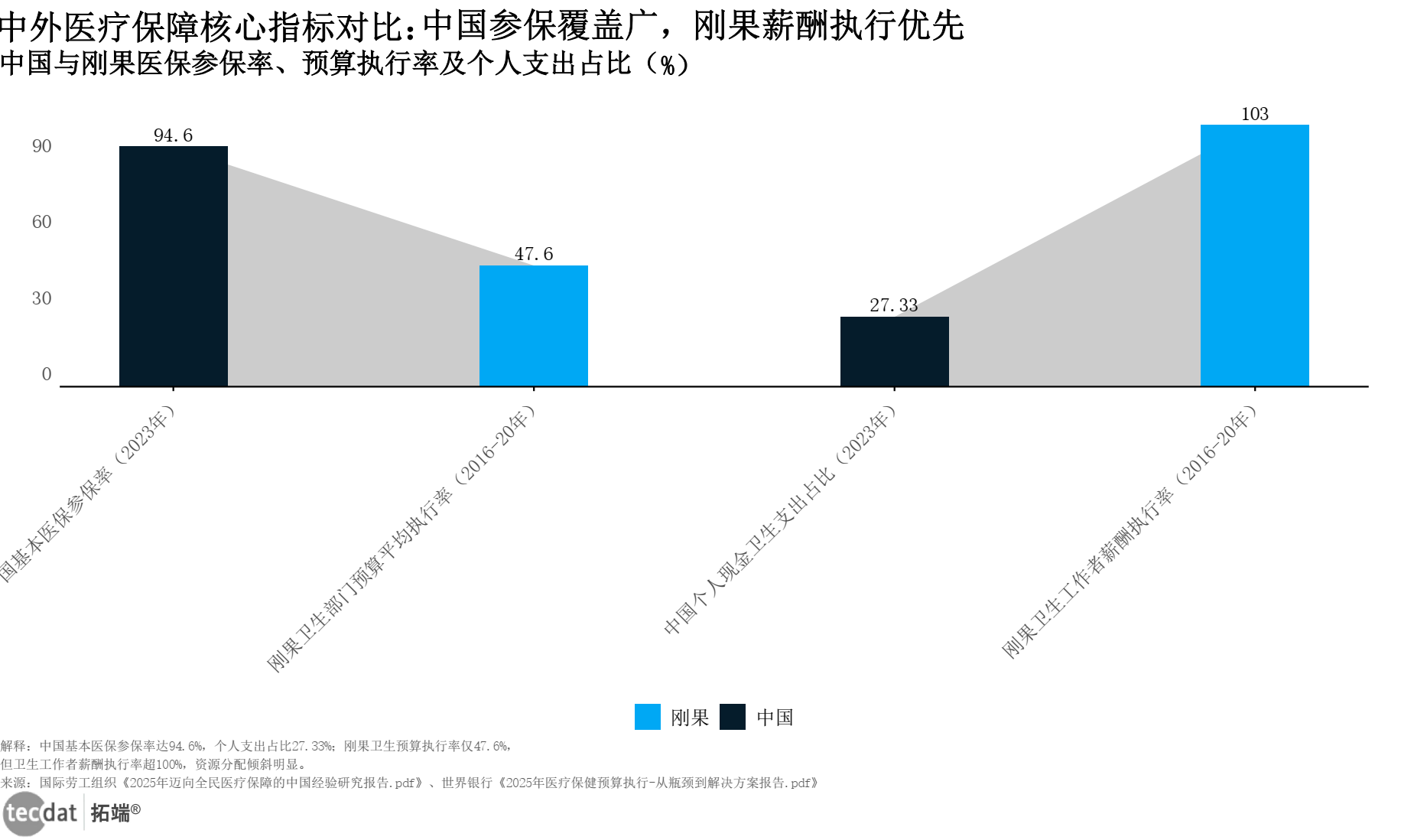 图表2-1呈现产业链关键指标:中国(政策完善型)2023年基本医保参保率94.6%(覆盖端),个人现金卫生支出占比27.33%(受益端负担);刚果(资源倾斜型)2016-20年卫生部门预算平均执行率47.6%(经办端效率),卫生工作者薪酬执行率103%(核心资源倾斜)。3秒解读:中国医保产业链“覆盖广、负担可控”,刚果侧重“核心环节保障”;行动建议:医保经办机构可借鉴中国“居住地参保”政策(2024年国务院办公厅政策),针对灵活就业人群(扩面重点)设计参保方案,同时参考刚果逻辑,优先确保基层医护人员待遇发放(稳定经办端人力)。