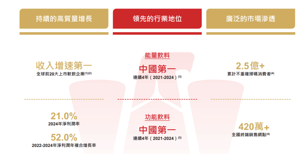 根据弗若斯特沙利文报告,按销量计,东鹏饮料在中国功能饮料市场自2021年起连续4年排名第一,市场份额从2021年的15.0%增长到2024年的26.3%。按零售额计,东鹏饮料是2024年第二大功能饮料公司,市场份额为23.0%。