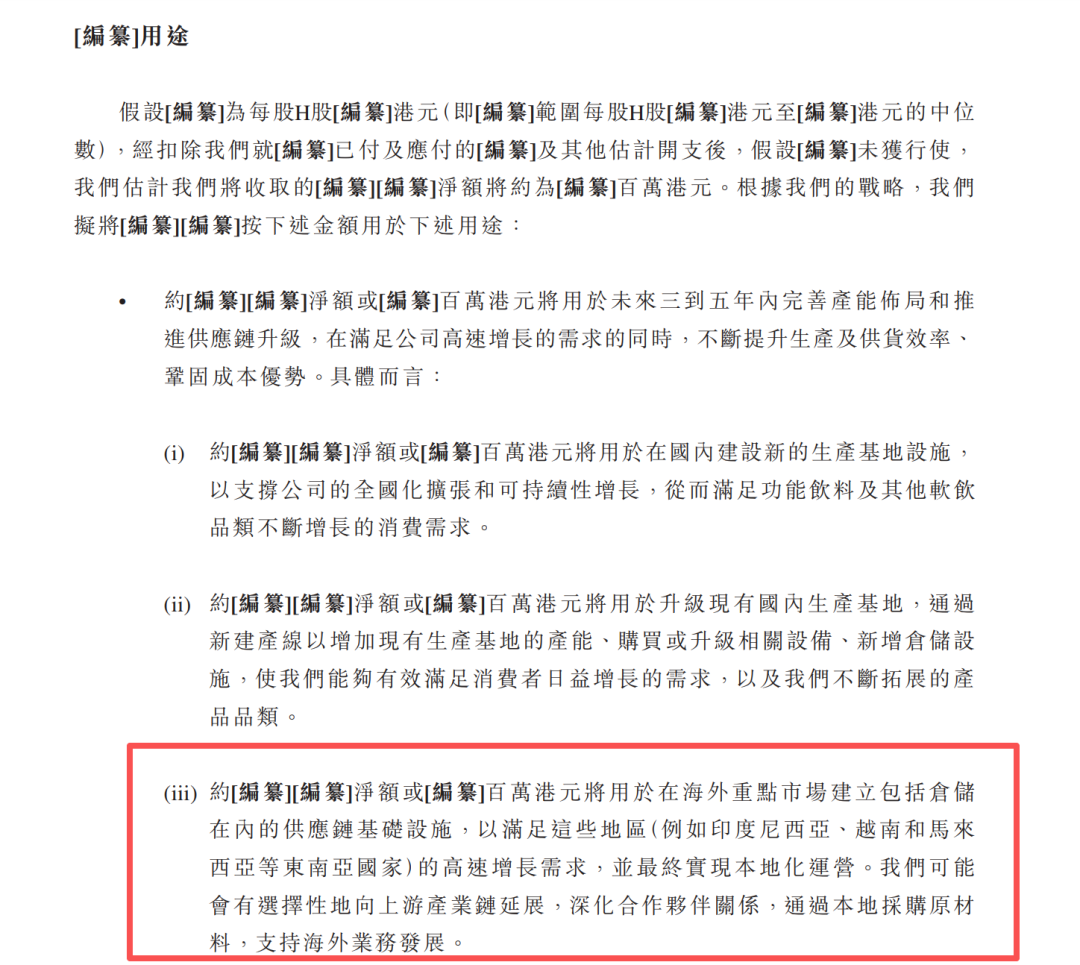 招股书提到,部分募集资金将用于在海外重点市场建立包括仓储在内的供应链基础设施,以满足这些地区(例如印度尼西亚、越南和马来西亚等东南亚国家)的高速增长需求,并最终实现本地化运营。公司可能会有选择性地向上游产业链延展,深化合作伙伴关系,通过本地采购原材料,支持海外业务发展。