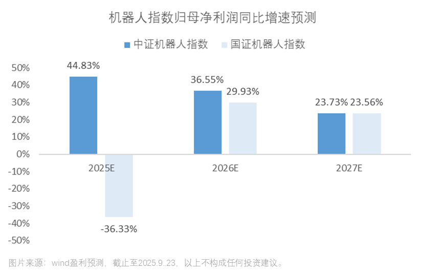 3)盈利预期光芒四射。2025年上半年,中证机器人指数前十大成分股中有7只实现营收同比增长、6只实现归母净利润同比增长,其中前两大权重股汇川技术/科大讯飞归母净利润分别增长40.15%/40.37%。根据wind预测,中证机器人指数2025年归母净利润同比增速达44.83%,国证机器人指数的-36.33%,且2026年的归母净利润同比增速也超过国证机器人指数。盈利能力更加优质、更加具有确定性,有望在行业的高景气周期迎来“戴维斯双击”。