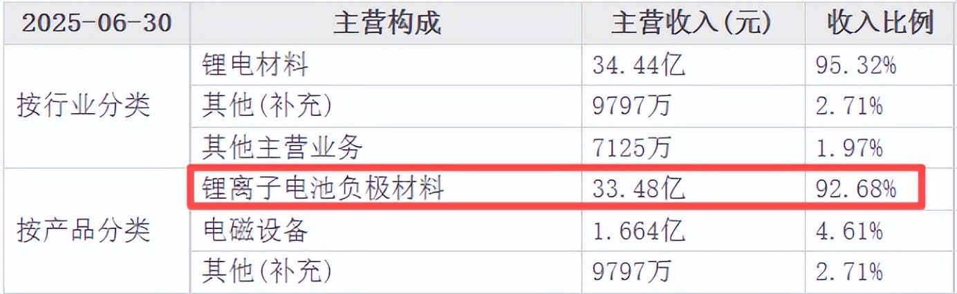 锂离子电池负极材料是中科电气最核心的营收来源,历年来占比维持在约90%的水平。具体来看,2025上半年,此业务营收33.48亿,占比高达92.68%。