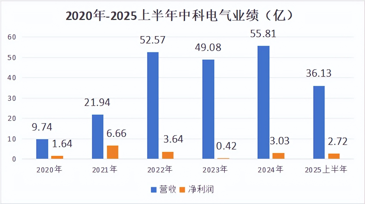 然而,2024年始,那个高成长的中科电气又回来了!该年度内公司营收55.81亿,同比提升13.72%;净利润3.03亿,同比大增626.56%。并且,2025上半年公司业绩高成长延续,营收、净利润增速约在60%、293%!