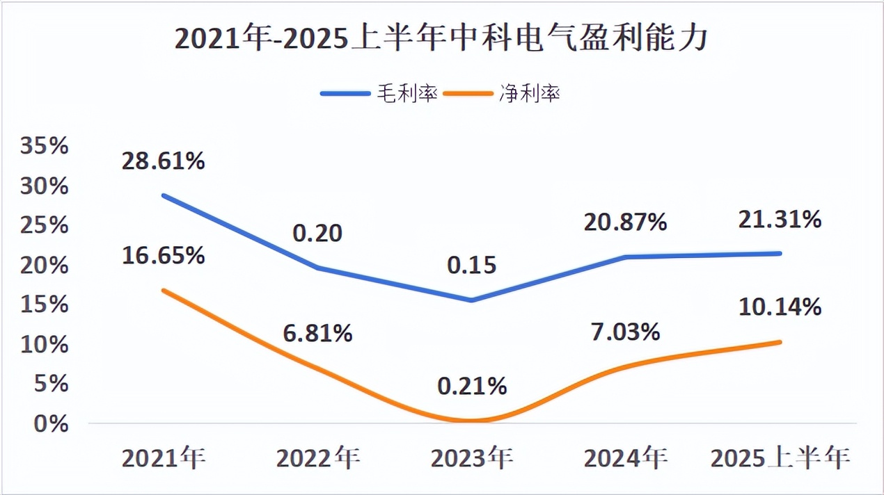 并且,盈利能力上,中科电气也迎来修复。其中,公司毛利率从2023年的15.4%恢复至2025上半年的21.31%,净利率同期从0.21%提升至10.14%,盈利能力整体修复明显。