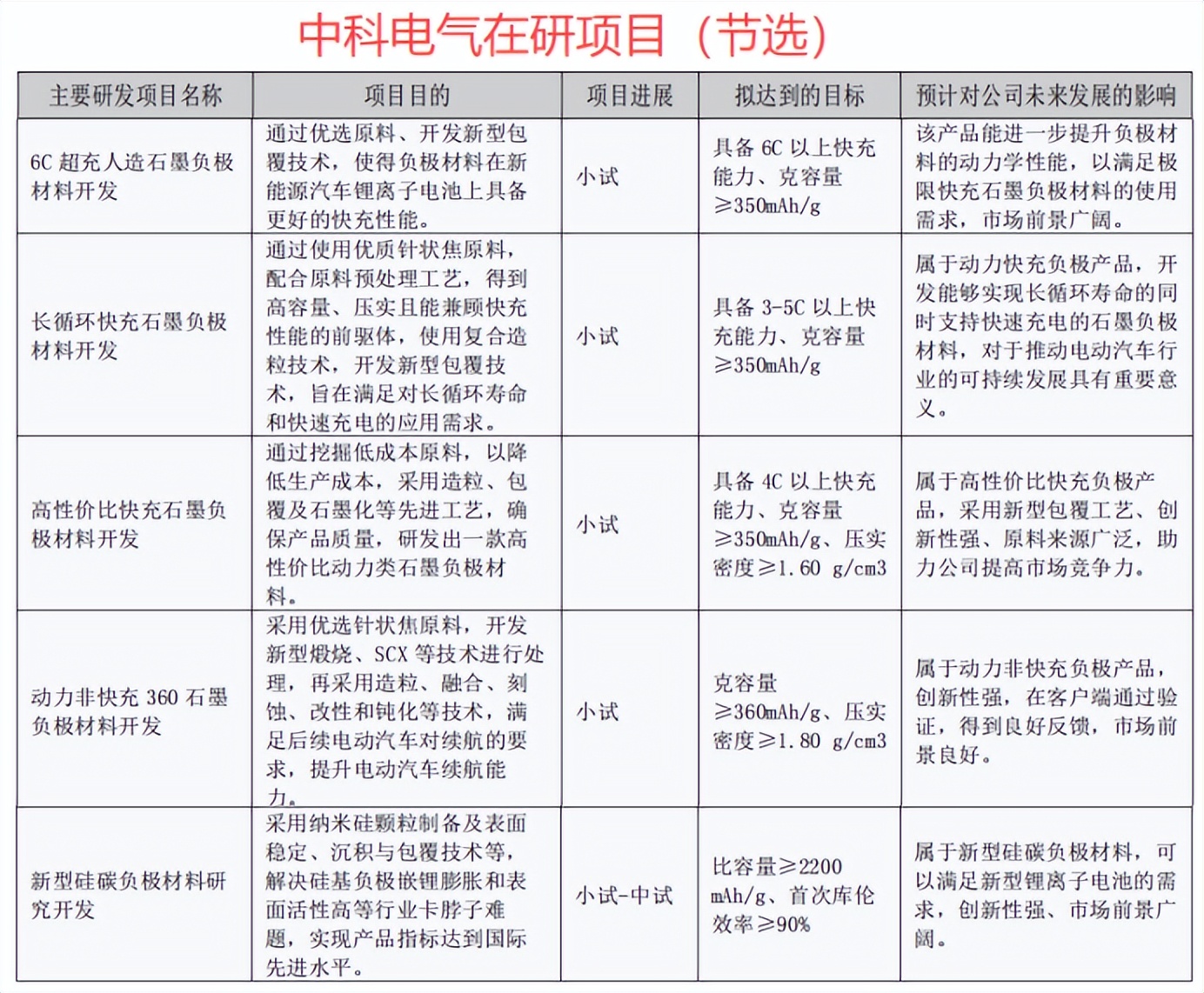 另一方面,提升电池充电速率上,中科电气快充负极已率先实现量产,做到产品克容量≥355mAh/g、充电倍率≥2C,循环寿命≥4000周等,性能优异。