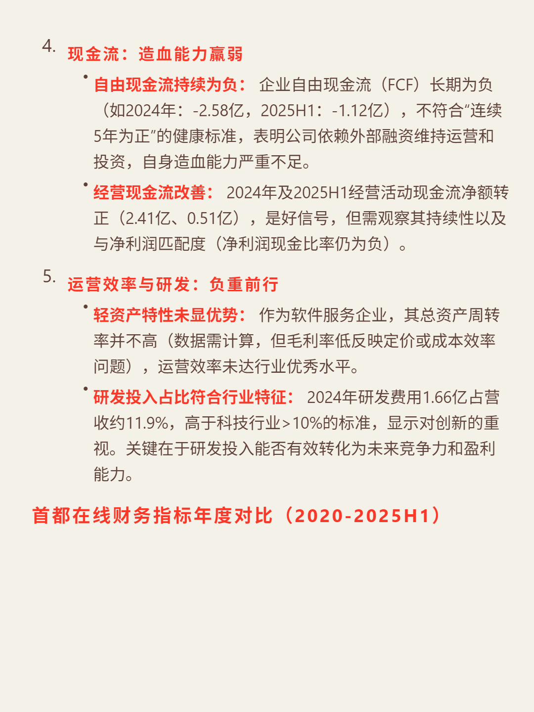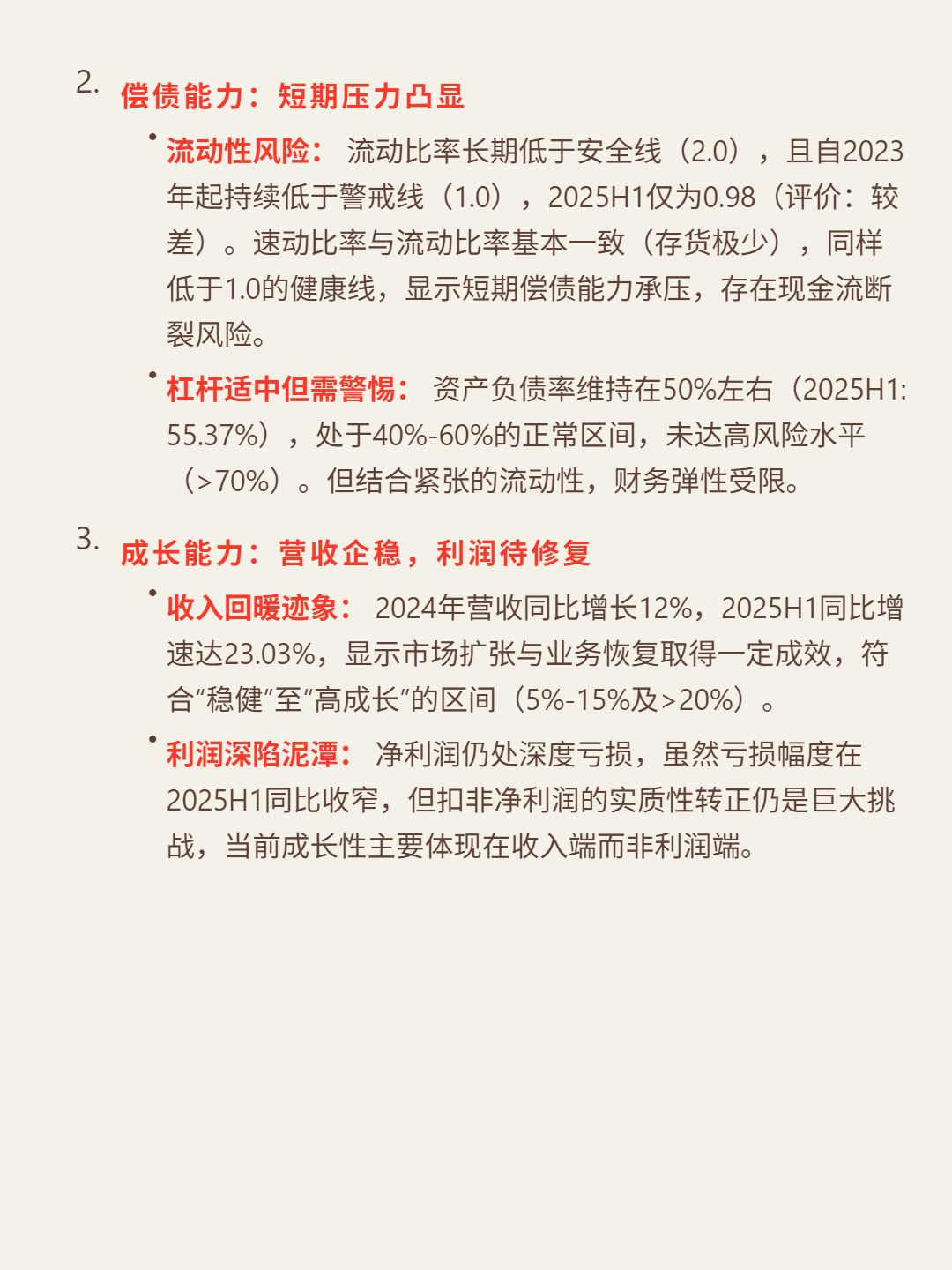 财务亮点:2025H1营收增速23.03%(2024年12%),收入端回暖。但净利润持续亏损(2025H1净利率-10.41%),流动比率0.98(低于1.0安全线),自由现金流长期为负(2024年-2.58亿)。2024年经营现金流转正(2.41亿),研发投入占比11.9%(高于行业标准),但盈利修复与短期偿债能力是关键挑战。