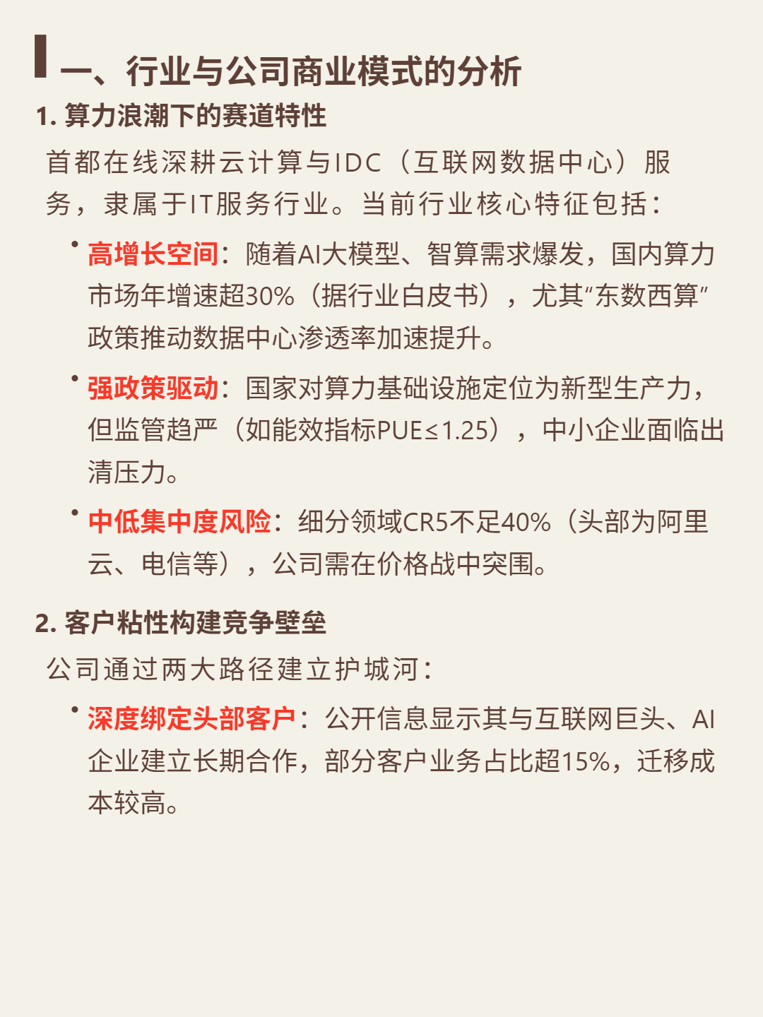 核心逻辑:首都在线主营云计算与IDC服务,行业年增速超30%(AI与“东数西算”驱动),但监管趋严(PUE≤1.25)、CR5不足40%。商业模式靠深度绑定头部客户(部分占比超15%)和多元算力布局(GPU+国产芯片)构建壁垒,重资产底座(固定资产占比超50%)支撑弹溢价。