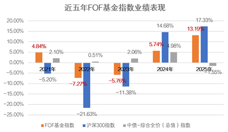 数据来源:Wind,时间截至2021.1.1-2025.10.10。指数过往收益不预示未来表现,不构成指数基金收益的承诺或保证。市场有风险,投资需谨慎。FOF基金指数代码为931153.CSI,沪深300指数代码为000300.SH,中债-综合全价(总值)指数代码为CBA00203.CS。